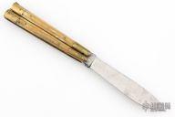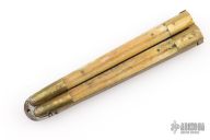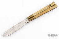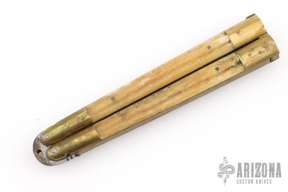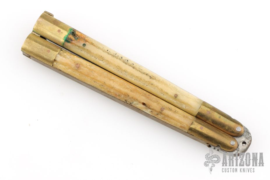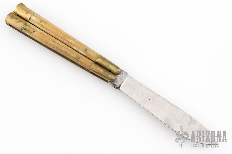This balisong from the Philippines features a drop point blade with a satin finish. The handle has brass bolsters, front and rear and jigged bone scales, and brass T-latch. Has scratches and patina, but that is normal for these, good condition. This one is missing the stop pin in the blade.