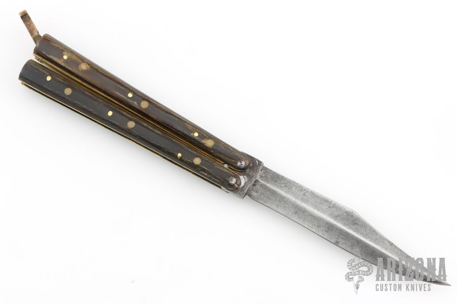 This balisong from the Philippines features a clip point blade with a satin finish. The handle has horn covers, brass T-latch and brass liners/frame. Has scratches and patina, but that is normal for these, good condition.