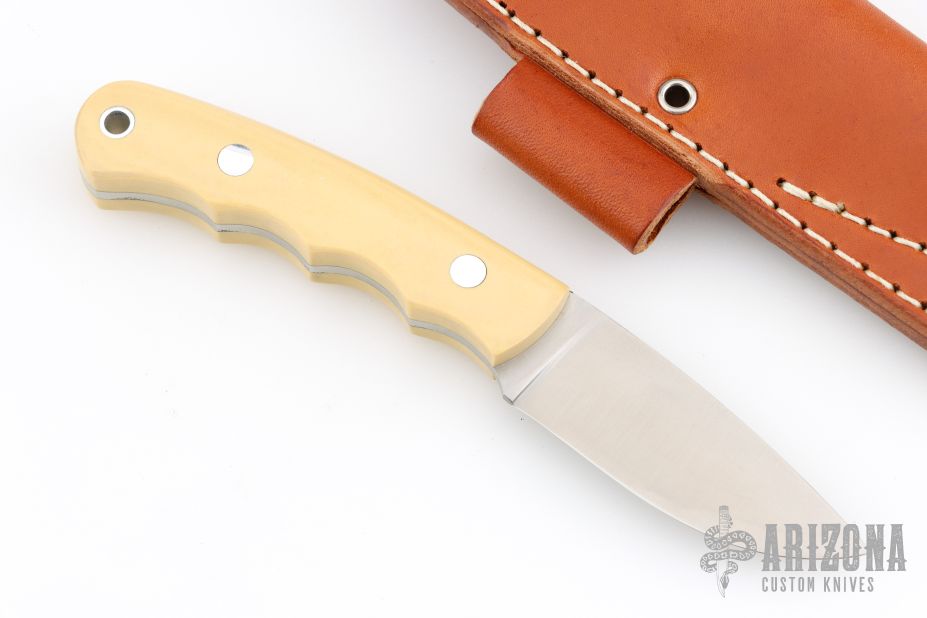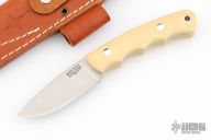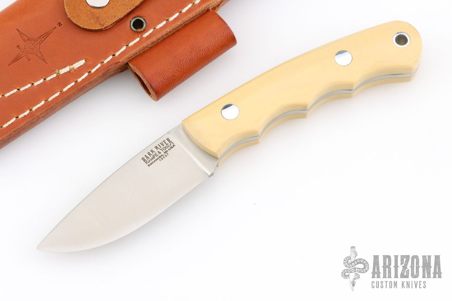 This Mini-Skinner by Bark River features a satin finished blade, .109" blade stock and .922" blade depth, full tang construction. The handle has antique ivory paper micarta scales with aluminum pins and lanyard hole. Comes with brown leather sheath and original box. Excellent condition.