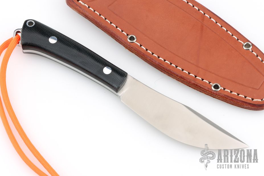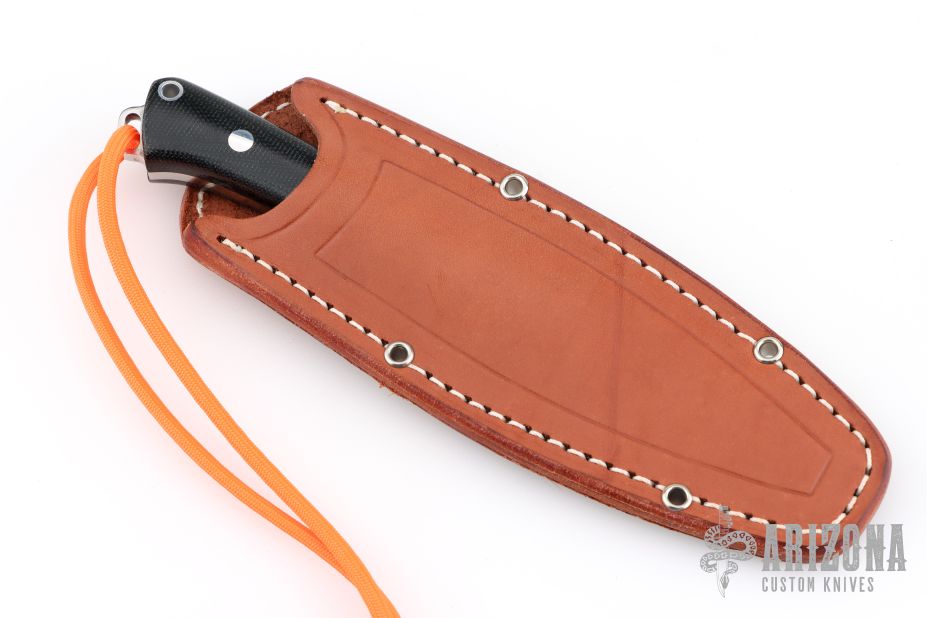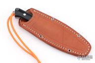 This Trail Buddy by Bark River features a satin finished blade with false top edge, .153" blade stock and 1.114" blade depth, full tang construction. The handle has black canvas micarta scales with aluminum pins and lanyard hole. Comes with original box and brown leather sheath. Excellent condition.
