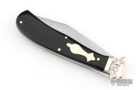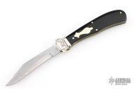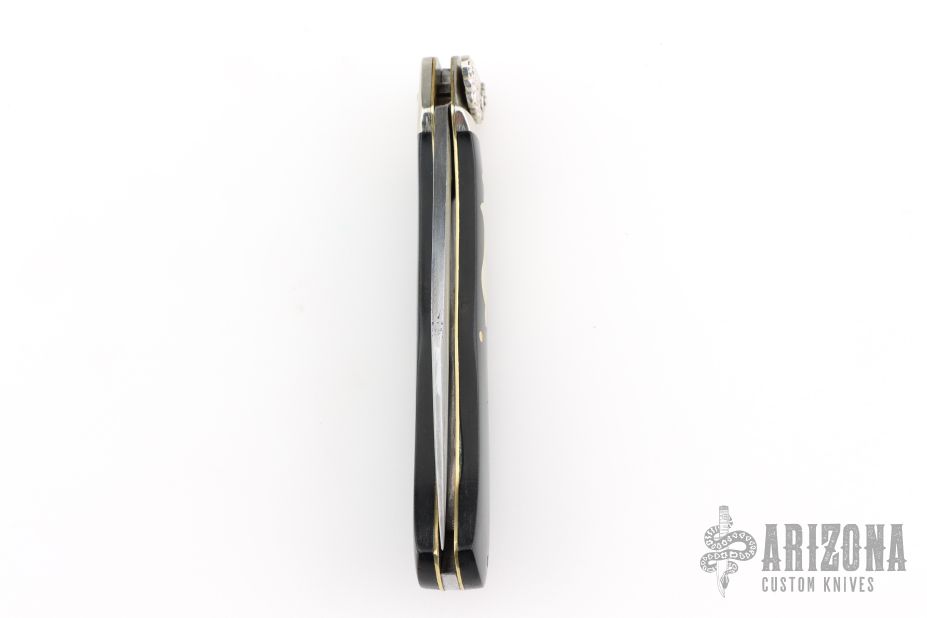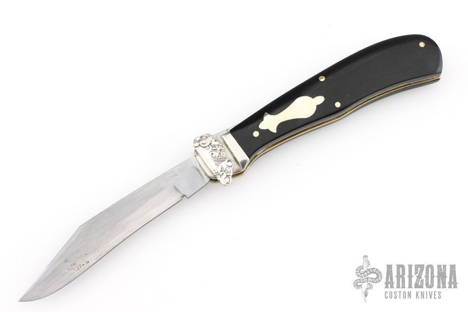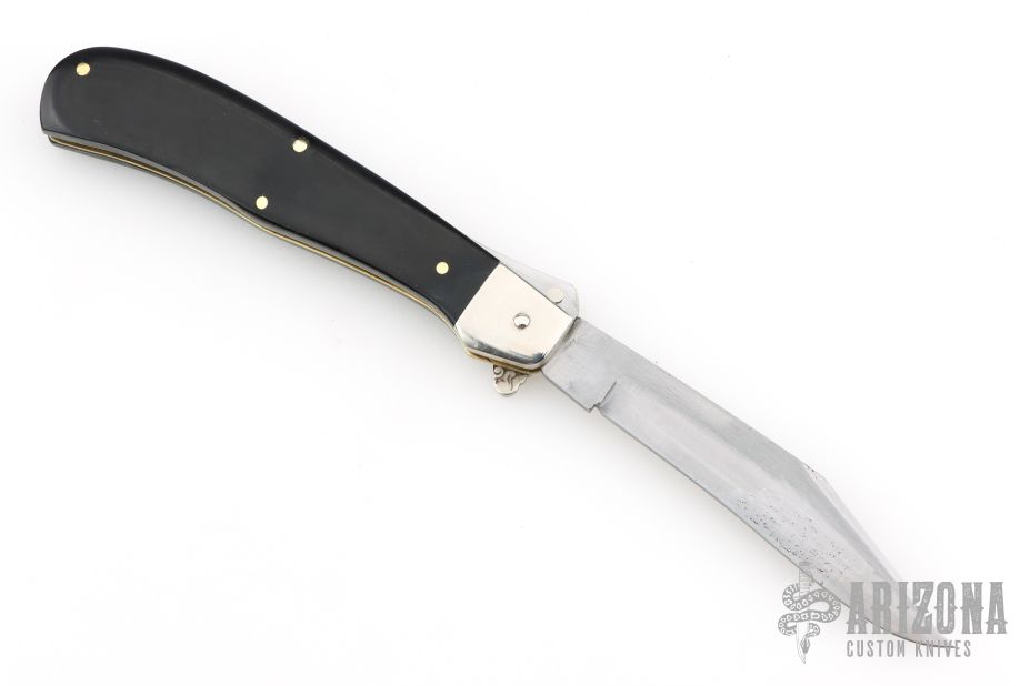 This Lever Auto by Aerial AC Mfg Co features a satin finished clip point blade. The handle has nickel silver bolsters, front and rear, micarta scales, brass liners, stainless steel backspacer. Strong action, nice lockup. Has some scratches, and a light patina. Good overall condition.