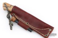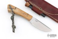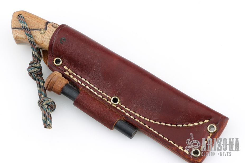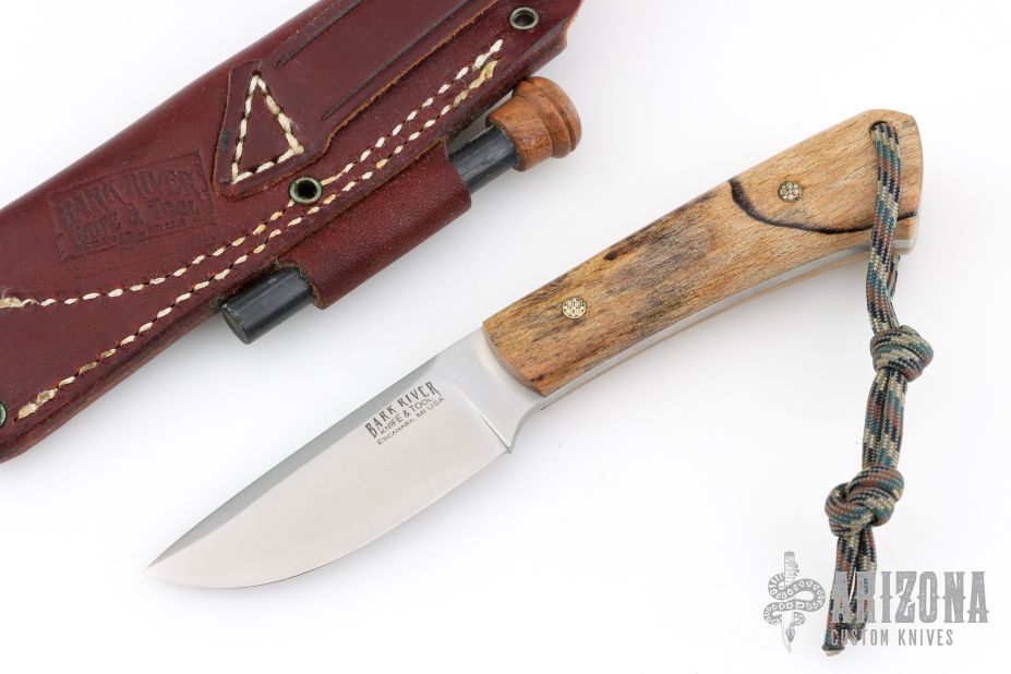 This Custom 2008 by Bark River features a finished blade with false top edge, .143" blade stock and 1.008" blade depth, full tang construction. The handle has spalted alder scales with mosaic pins and lanyard hole. Comes with original box and leather sheath. Excellent condition.