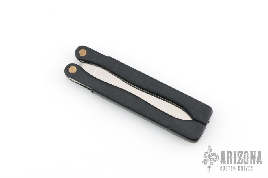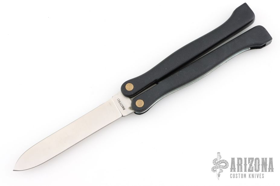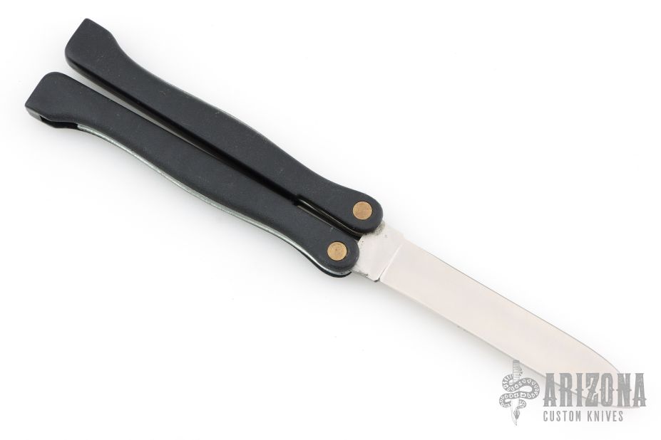This Vintage Balisong has a satin finished stainless steel clip point blade. Handle has black covers with steel liners and springs, the handles move like slipjoints. Has some light scuffs and scratches, excellent condition for its age.