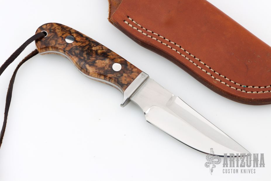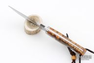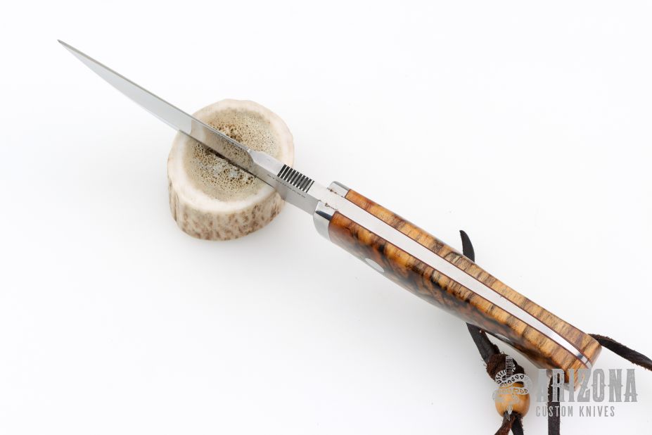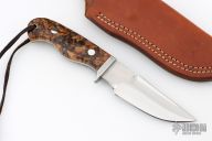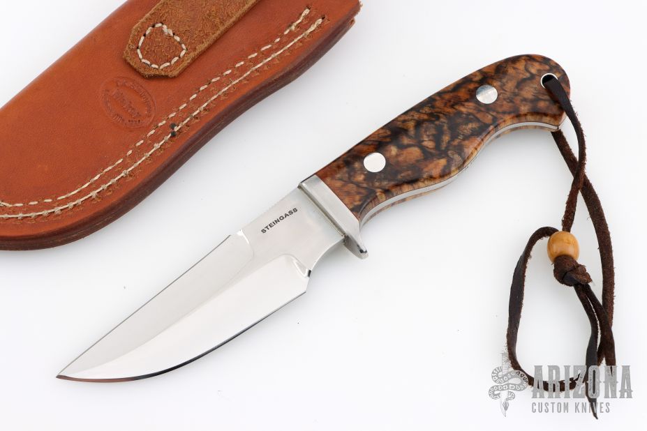 This fixed blade by Tim Steingass features a mirror polished blade with a sharpened top edge, notched thumbrest, .201" blade stock and 1.386" blade depth, full tapered tang construction.  The handle features a stainless steel guard, salted wood scales with red liners. Includes a brown leather sheath. Excellent condition.