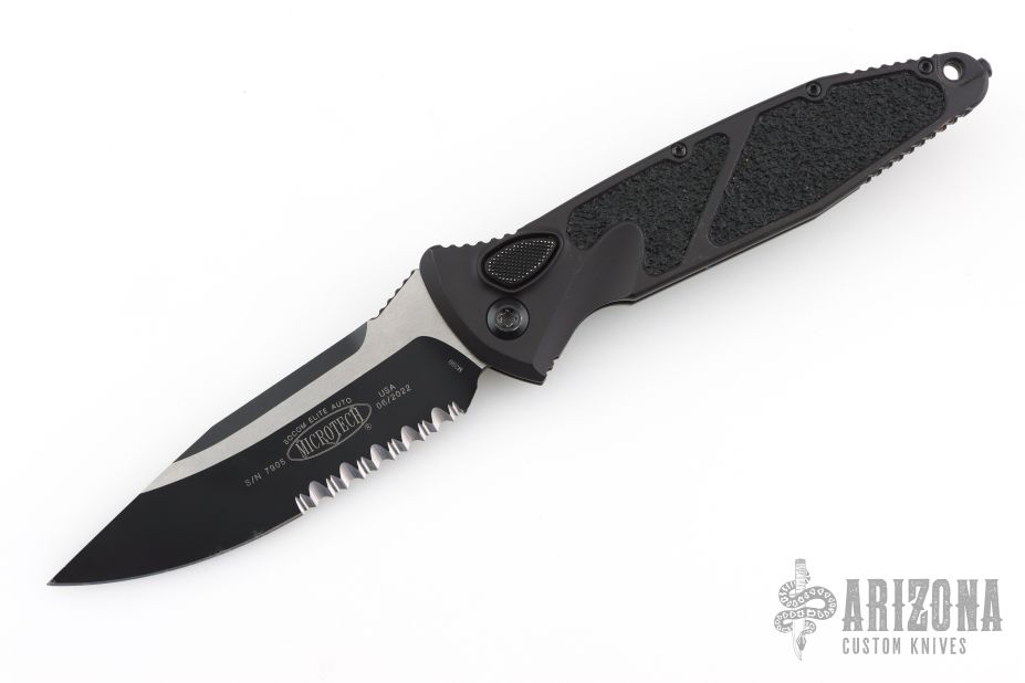 This Socom Elite Auto from Microtech has two toned drop point partially serrated blade with notched thumbrest. The handle has a black aluminum frame with non-slip rubber inserts and a tip down stainless steel clip. Dated 06/2022 and S/N 7905. Includes original box. Has scuffs and scratches, good condition; great user condition otherwise.