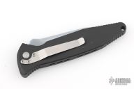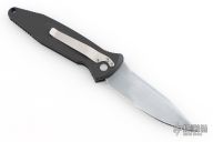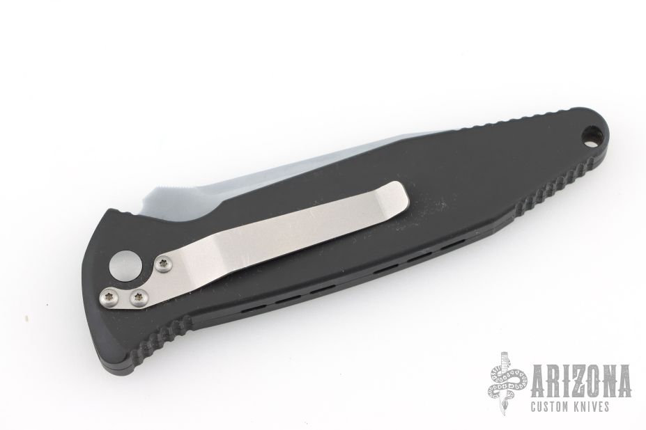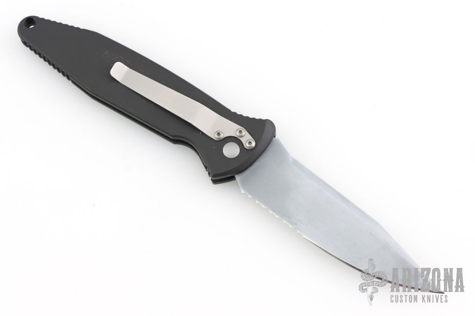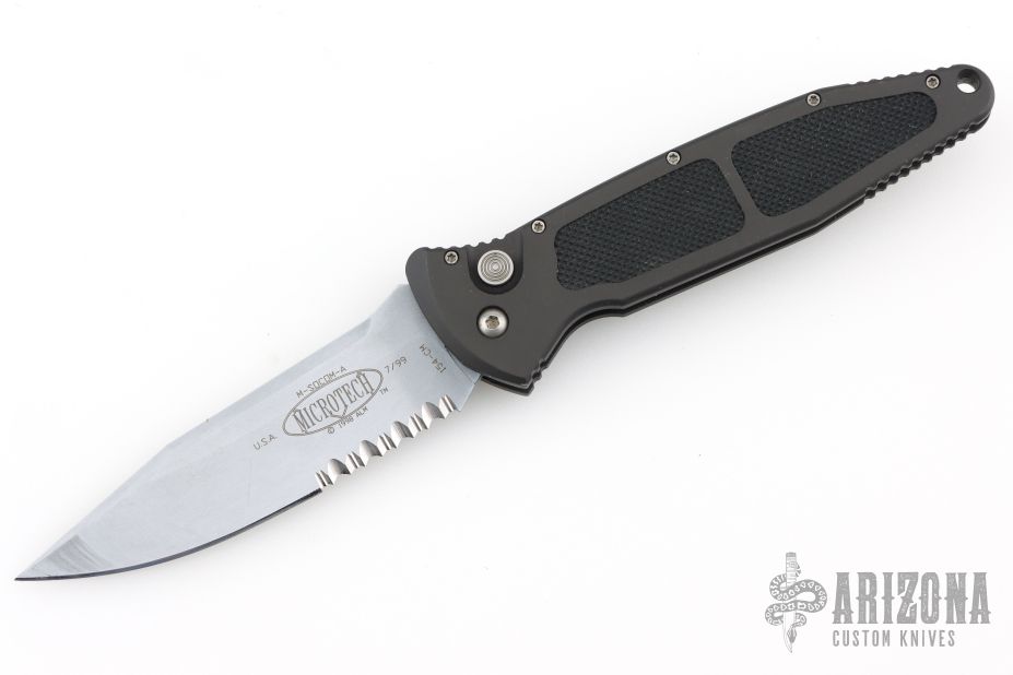 This Mini Socom-A by Microtech has a silver coated partially serrated blade with notched thumbrest. The handle is composed of black aluminum with non-slip inserts. Dated 7/99. Stainless steel clip. Comes with original clamshell style box, papers, and nylon belt sheath. Has scuffs and scratches, great condition for its age and otherwise.