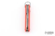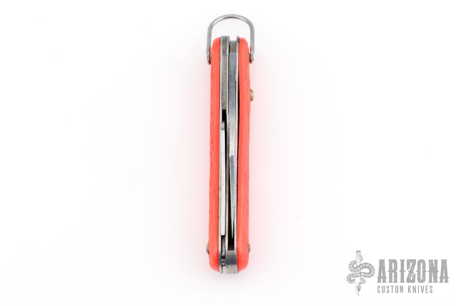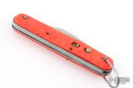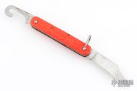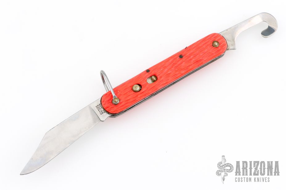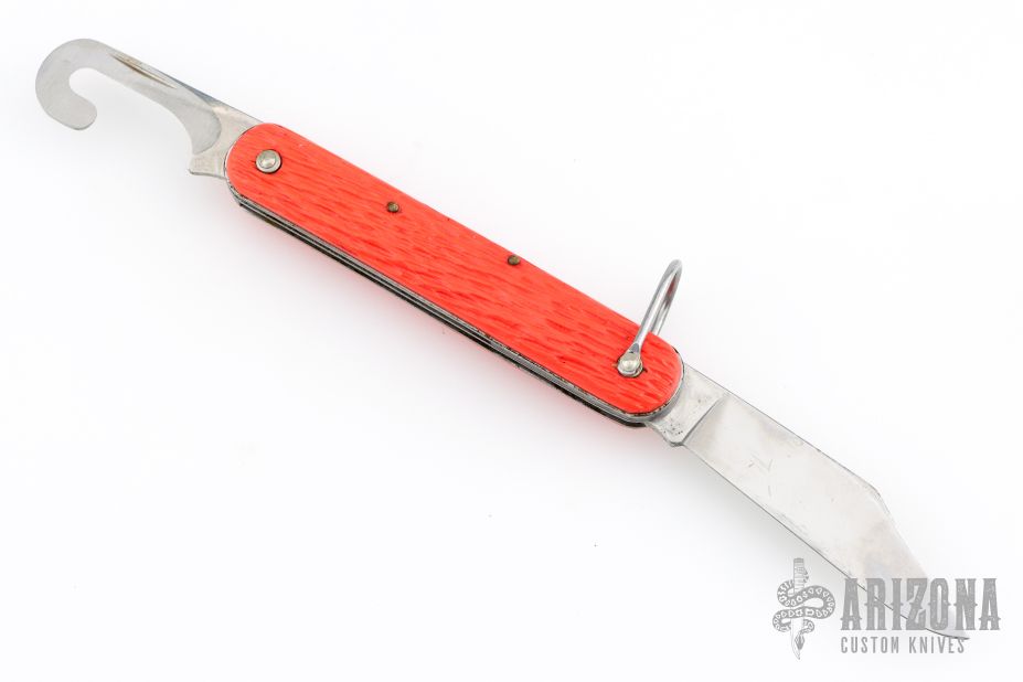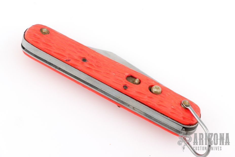 This knife by Schrade features a clip point blade. The handle has orange jigged scales, stainless steel liners and backspacer. Has Safety. Has some blade play and scratches, has been resharpened, otherwise the knife is in good condition.