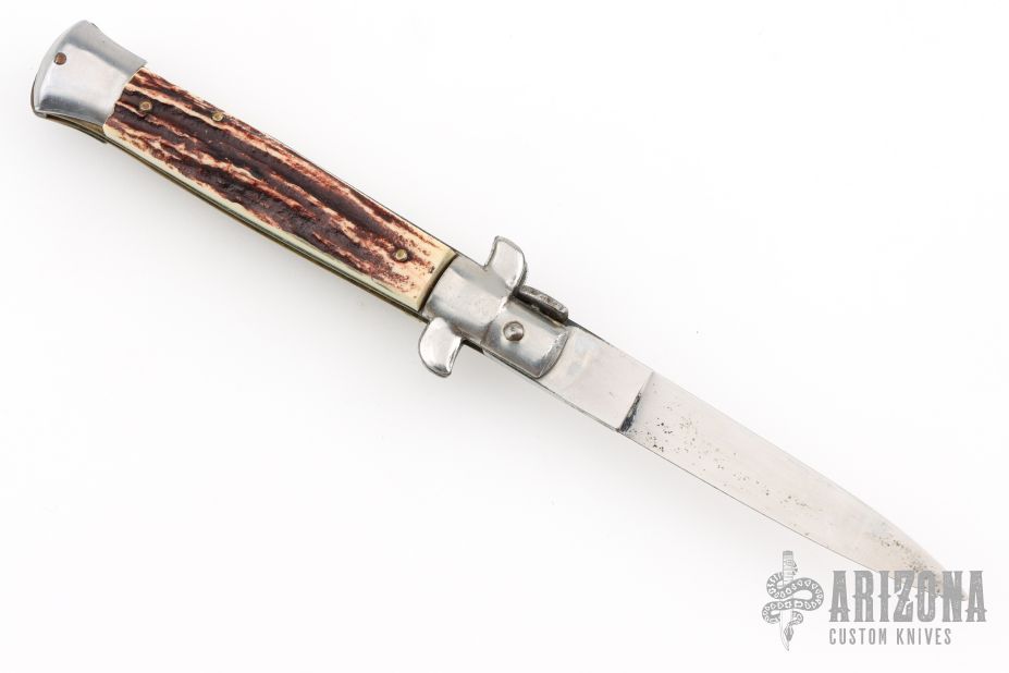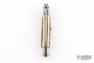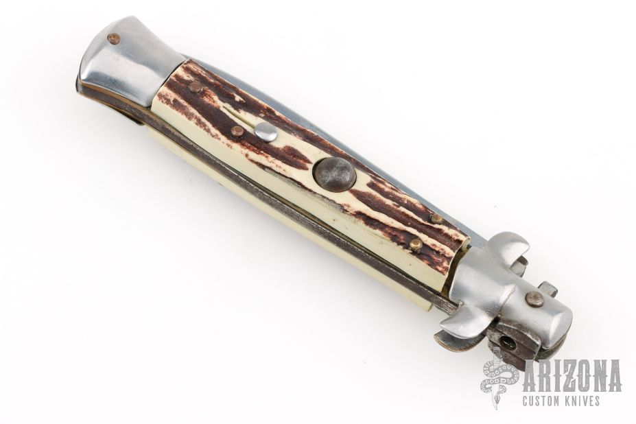 This Swivel Bolster features a bayonet blade with false top edge. The handle is comprised of steel bolsters and pommel with faux stag scales over brass liners and stainless steel backspacer. Has scratches, and patina, otherwise excellent Condition.