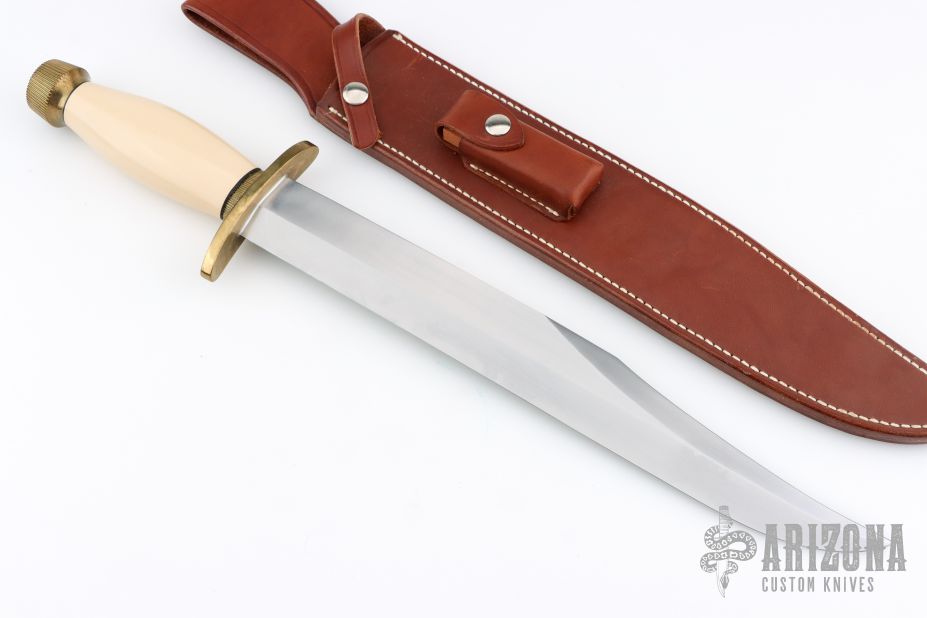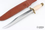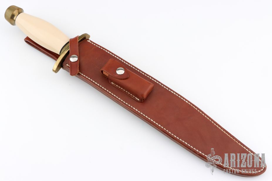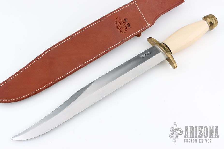 The 13" Randall Thorp Bowie by Randall Made Knives is similar to types used by Confederate troops. This one has an 13" carbon steel blade with sharpened top edge, .230" blade stock and 1.634" blade depth, hidden tang construction. The handle has a forward curved brass guard and scalloped butt cap, ivorite grip with black spacers. Comes with a brown leather sheath. Excellent condition.