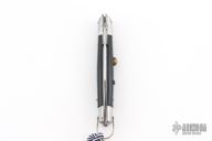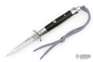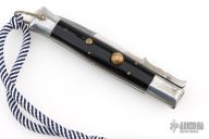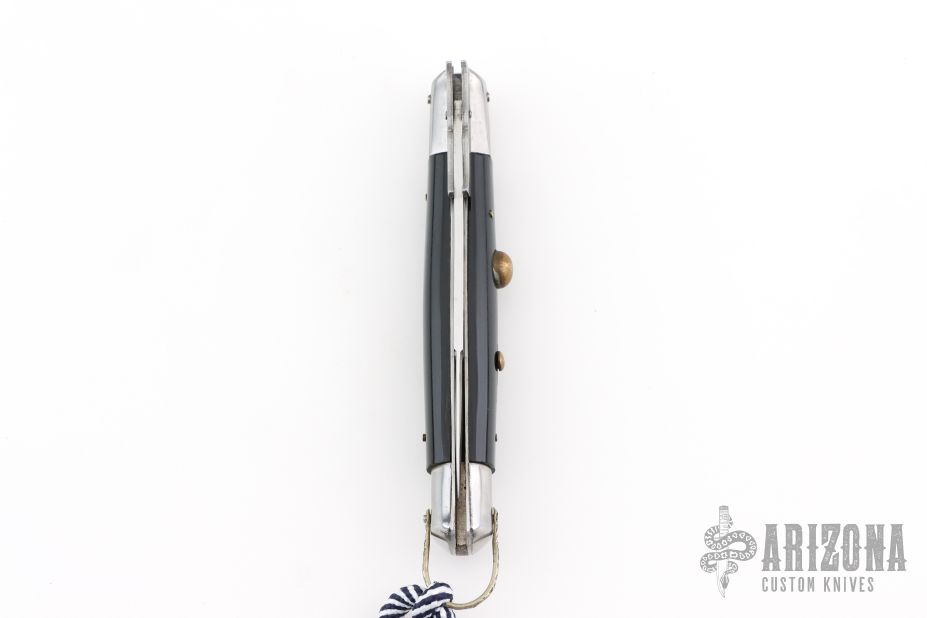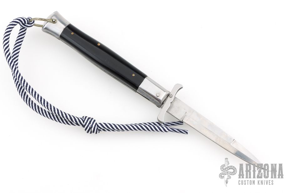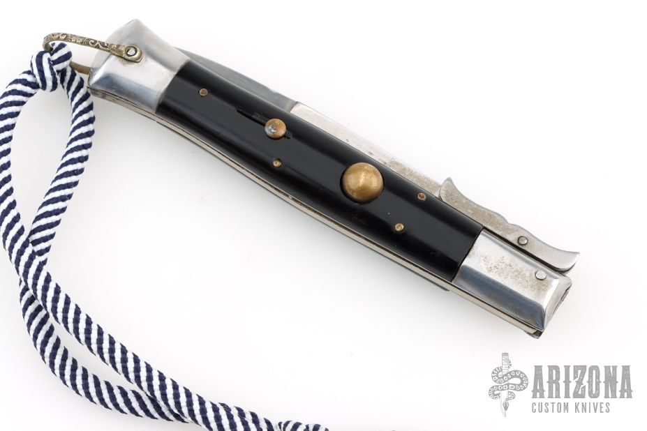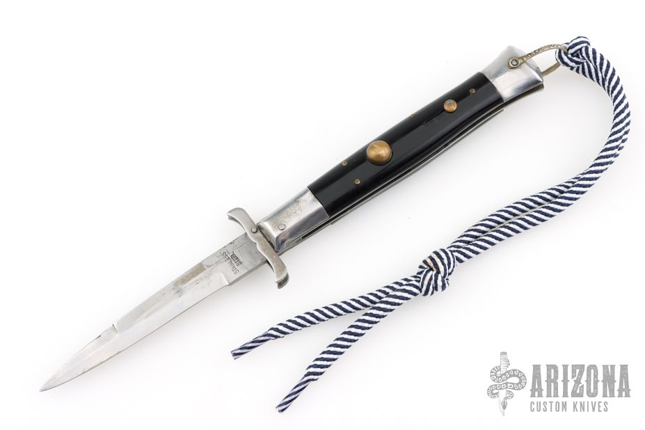 This 9" Swinguard Auto has a polished stainless steel spear point blade. Handle has black scales with stainless steel bolsters and pommel, stainless liners, brass pins/button, stainless steel backspacer, and a safety. Has engraved silver bail. Has scuffs and scratches, good condition otherwise.