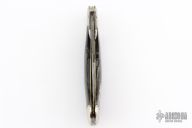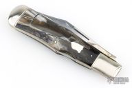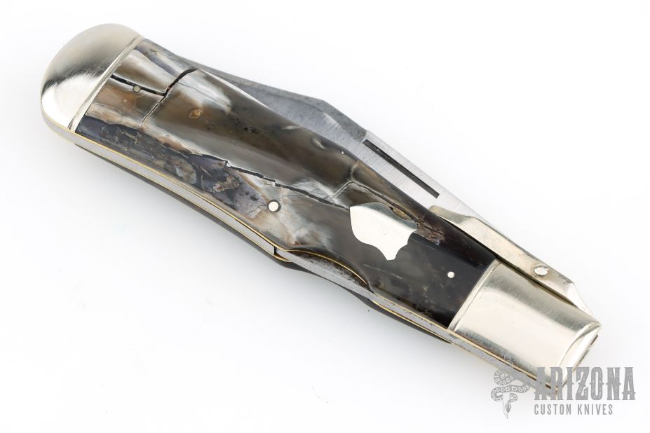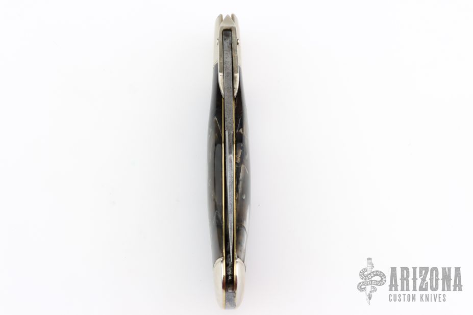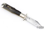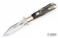 This swing guard by Cattaraugus features a mirror polished clip point blade with a single nail nick.  The handle features nickel silver front/rear bolsters, mammoth covers, brass liners and a silver escutcheon. Has scuffs and scratches, great overall condition.