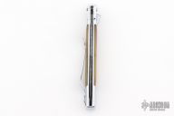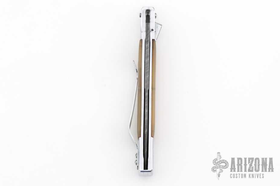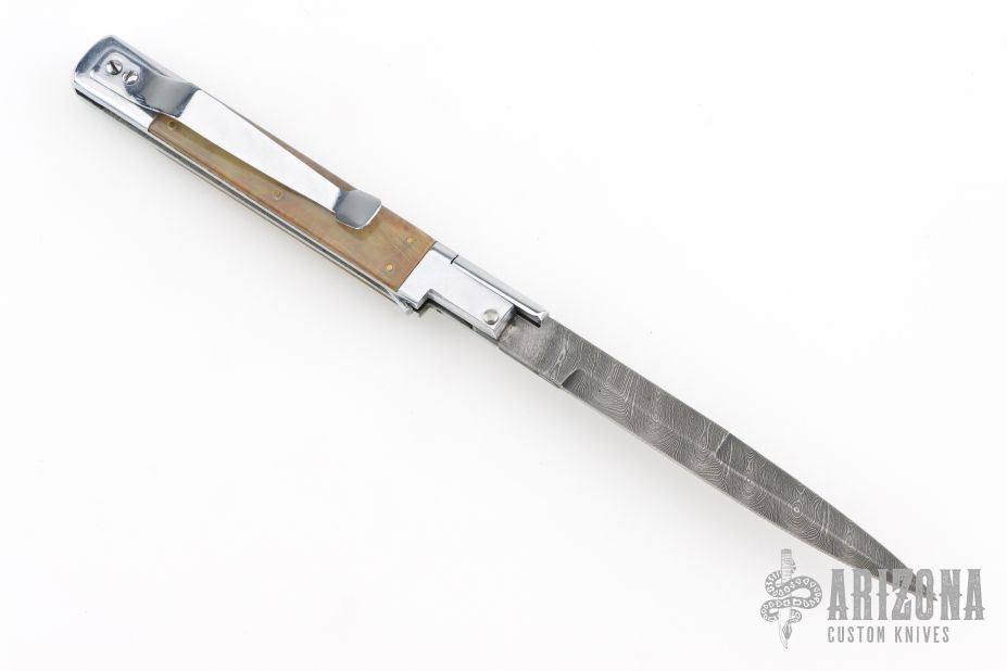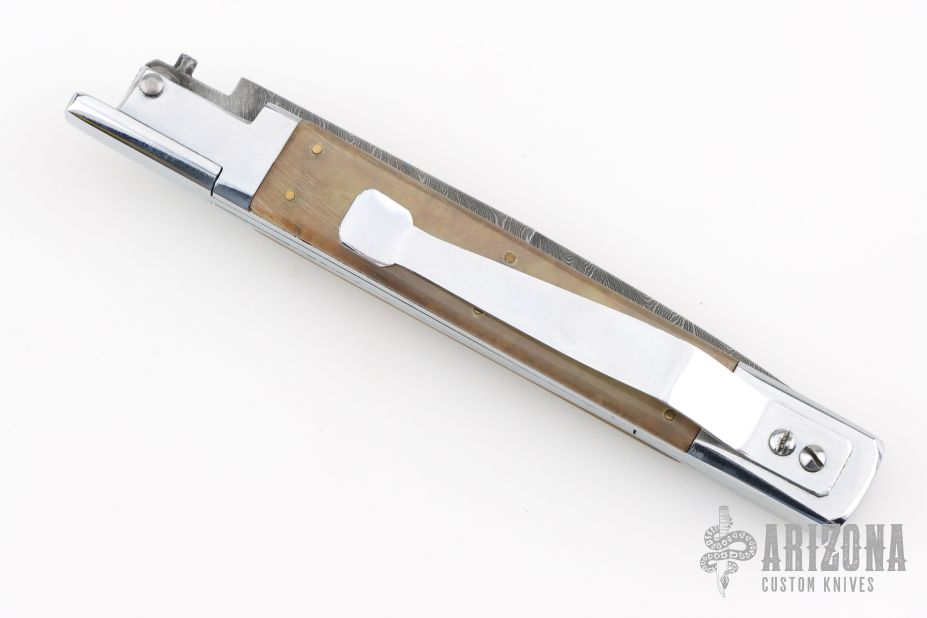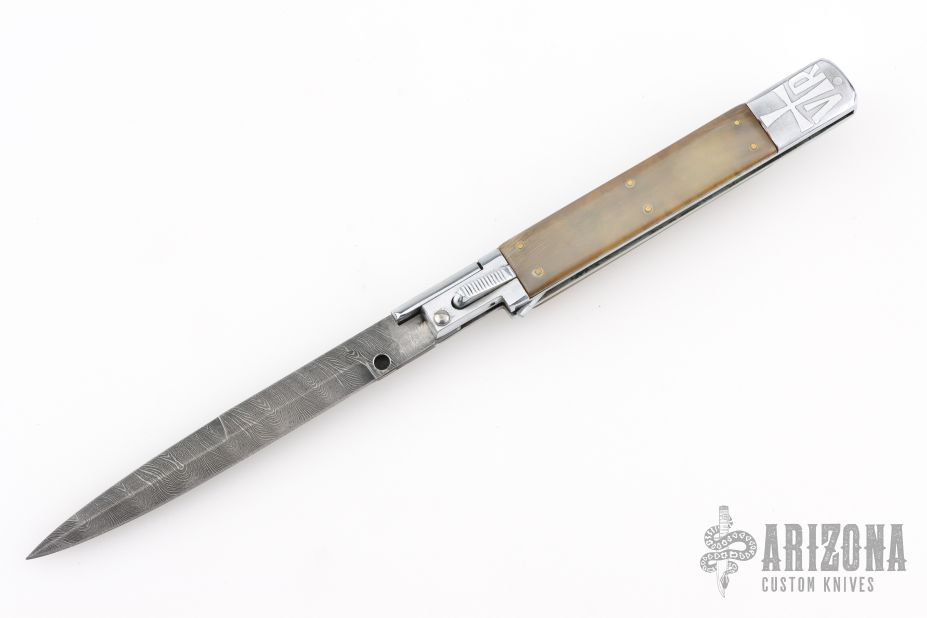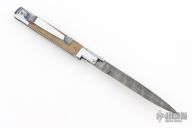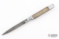 This Picklock Auto by Agasi Hambartsumian of Armenian Doctor Knives features a Damascus bayonet ground blade with a false top edge. The handle has a blued steel frame with fileworked stainless steel backspacer, sheep horn scales with brass pins. Has some light scratches, excellent condition otherwise. Tip up clip.
