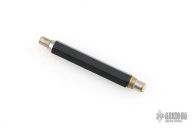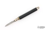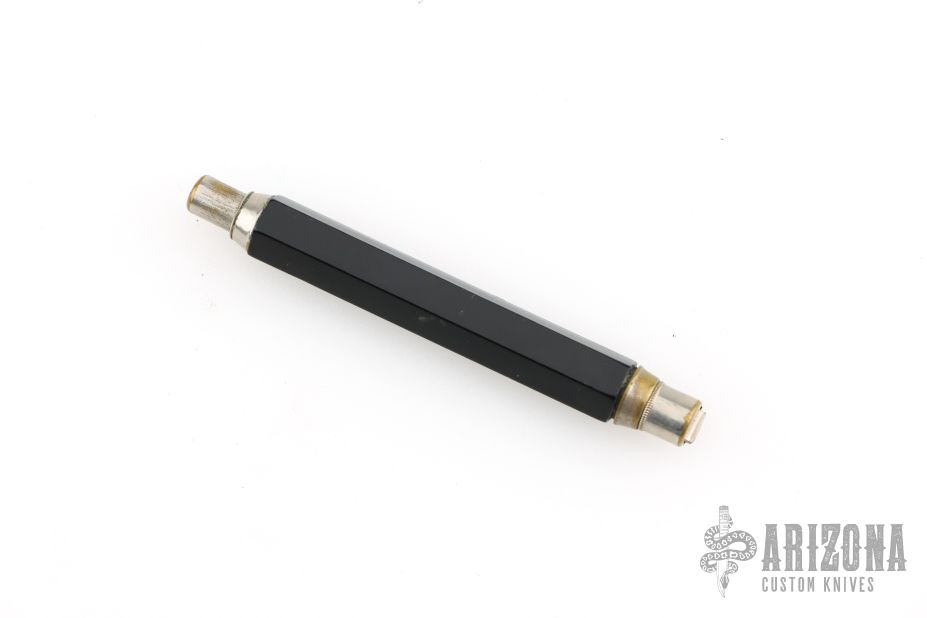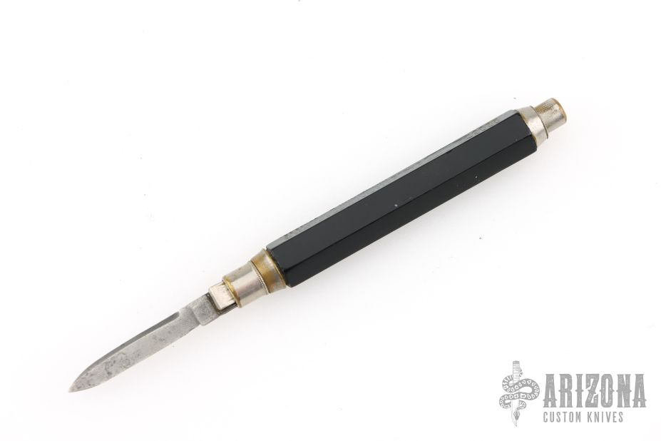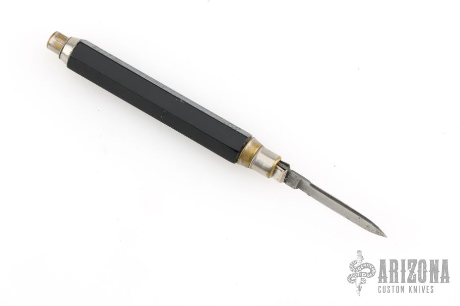 This gravity knife from Eagle Pencil Co features a satin finished blade, silver ferrule, black hexagonal body, silver button. Press the button to drop the blade, press the button and flip the knife to retract it. There are some scratches, and patina, great overall condition for its age and otherwise.