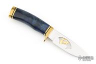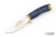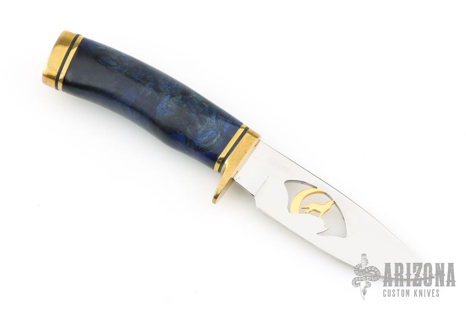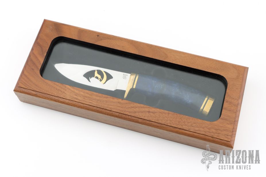 This knife by Buck features a mirror finished blade with a gold plated howling wolf cutout, .138" blade stock and 1.187" blade depth, hidden tang construction. The handle has a brass guard and butt with a dyed and stabilized burl wood grip, black and brass spacers. Comes with a wooden display box. Excellent condition.