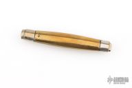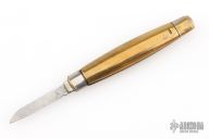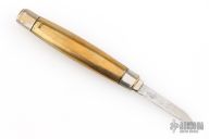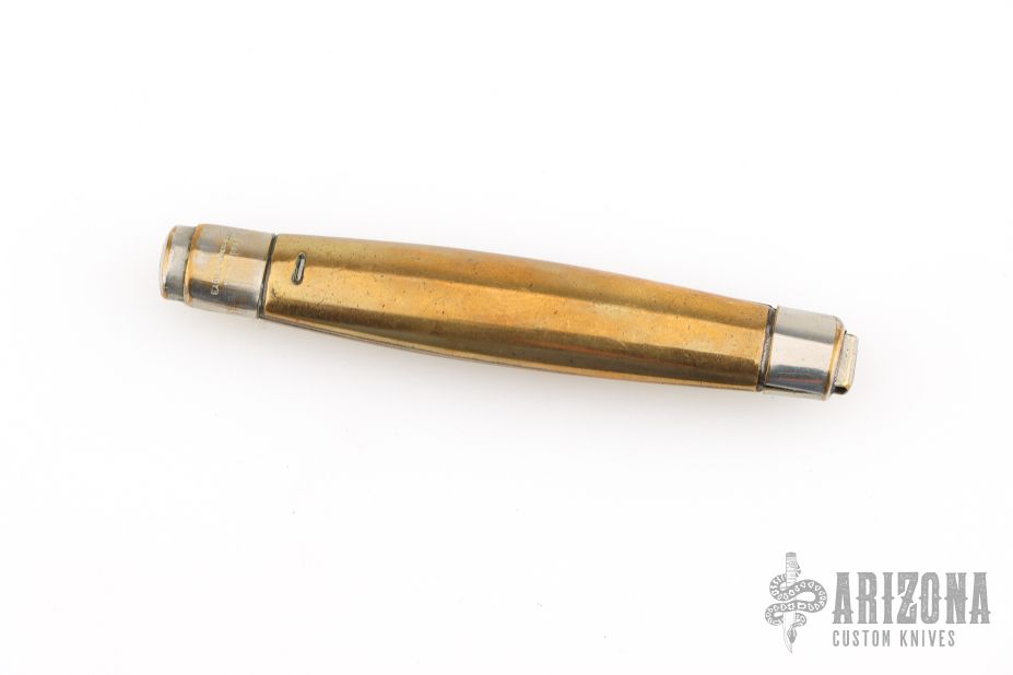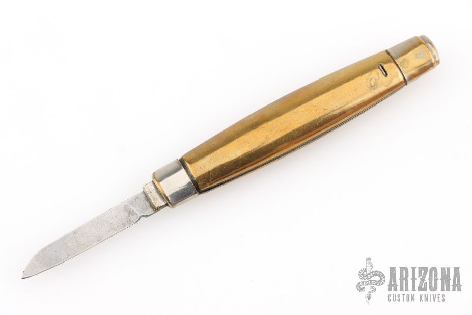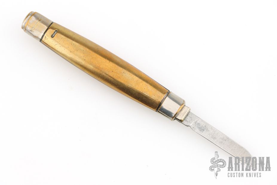 This gravity knife from Eagle Pencil Co features a satin finished blade, gold color body, and silver color button. Press the button to drop the blade, press the button and flip the knife to retract it. There are some scratches, and patina, great overall condition for its age and otherwise.