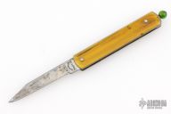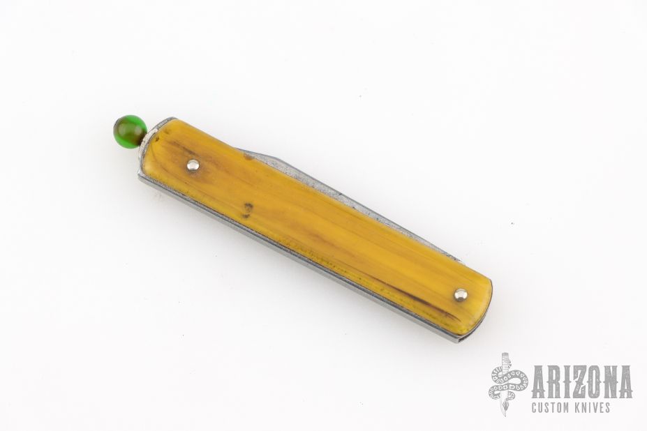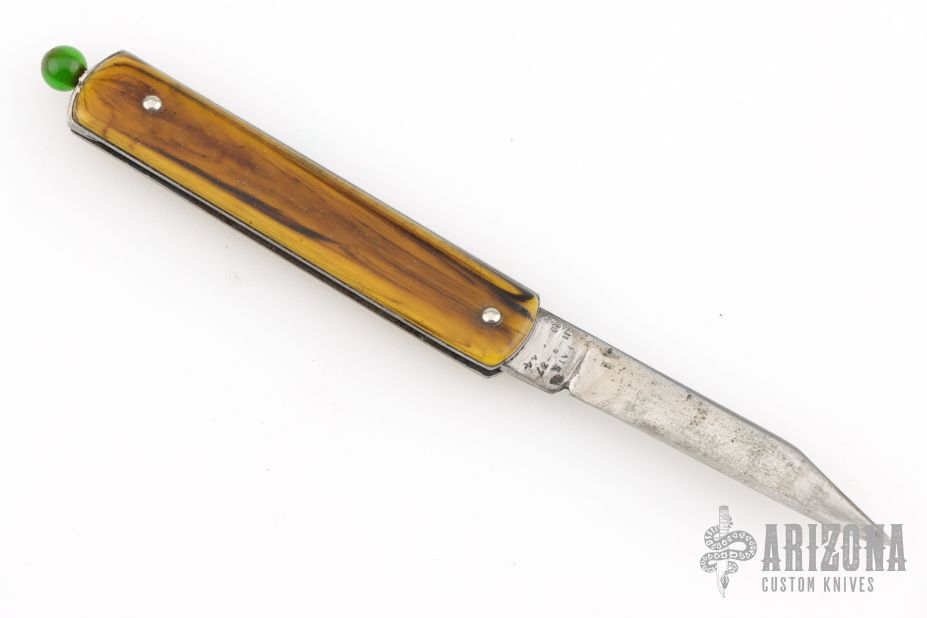 This little pull auto by G Schrade features a clip point blade. The blade's ricasso reads "PATS 11-9-27 10-19-44" which should be some indication of how old it is. It has white scales, probably bakelite or something, brass liners, and a little ball at the butt, when you pull it the knife opens, has a strong spring, knife does not lock in the open position. Very old, has scratches, has been used, good condition for its age.