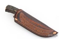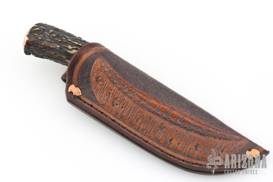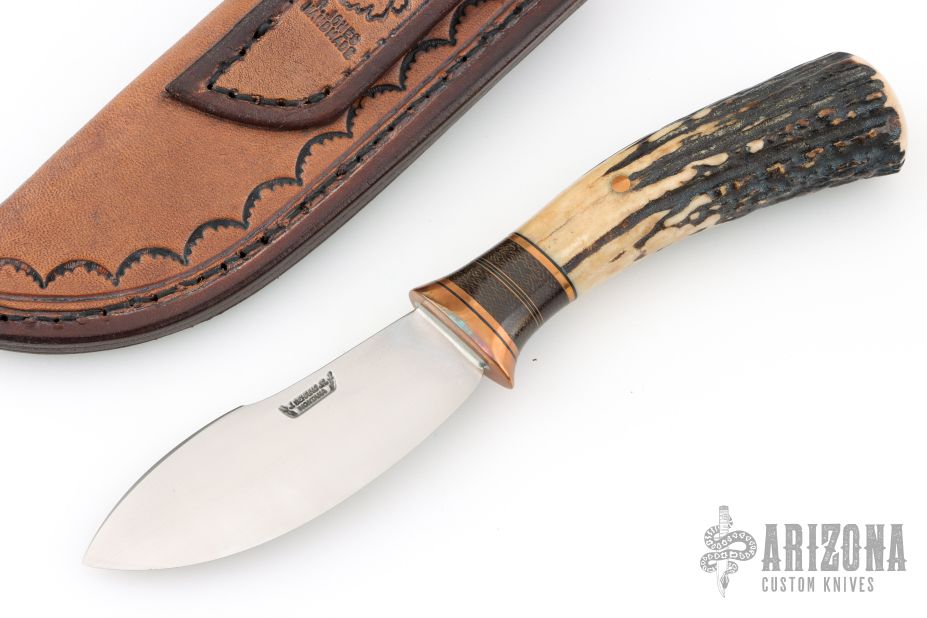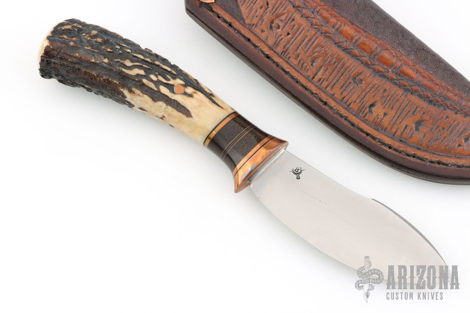 This Skinner by James Behring features a satin finished convex ground blade with .111" blade stock and 1.210" blade depth, hidden tang construction. The handle has a copper guard, stag grip with black/copper/green canvas micarta spacers and a copper pin. Comes with a hand tooled brown leather sheath with copper arrowhead rivets by Mudbone Jones. Has a couple very light scratches, otherwise excellent condition.