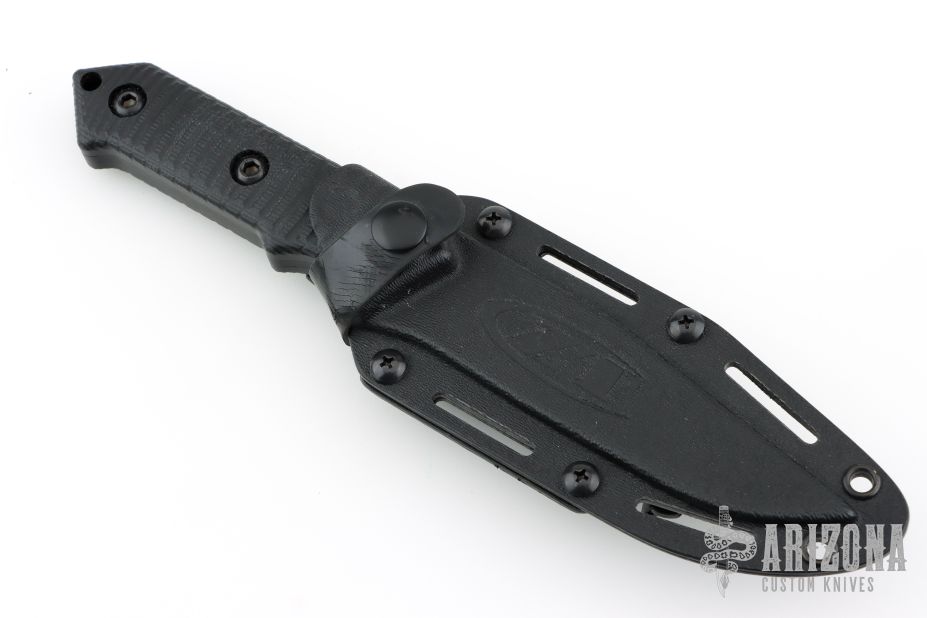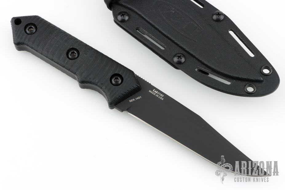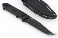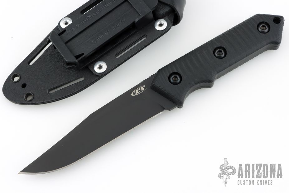 This ZT 0160 features a black blade with false top edge and a notched thumbrest, .159" blade stock and 1.215" blade depth, full tang construction with black G-10 scales. Comes with a black kydex sheath. #1451. Excellent condition.
