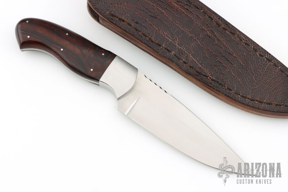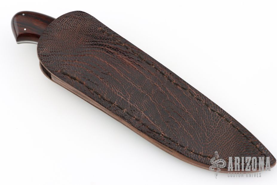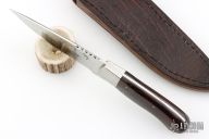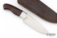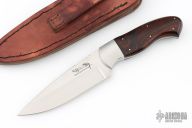 This hunter by Kosie Steenkamp has a hand rub satin finished blade with a fileworked thumbrest, .122" blade stock and 1.455" blade depth, full tapered tang construction. The handle has stainless steel bolsters with ironwood burl scales, black/white liners and stainless steel pins. Comes with a brown leather sheath with exotic leather overlay. Has a couple very light scratches, otherwise excellent condition.