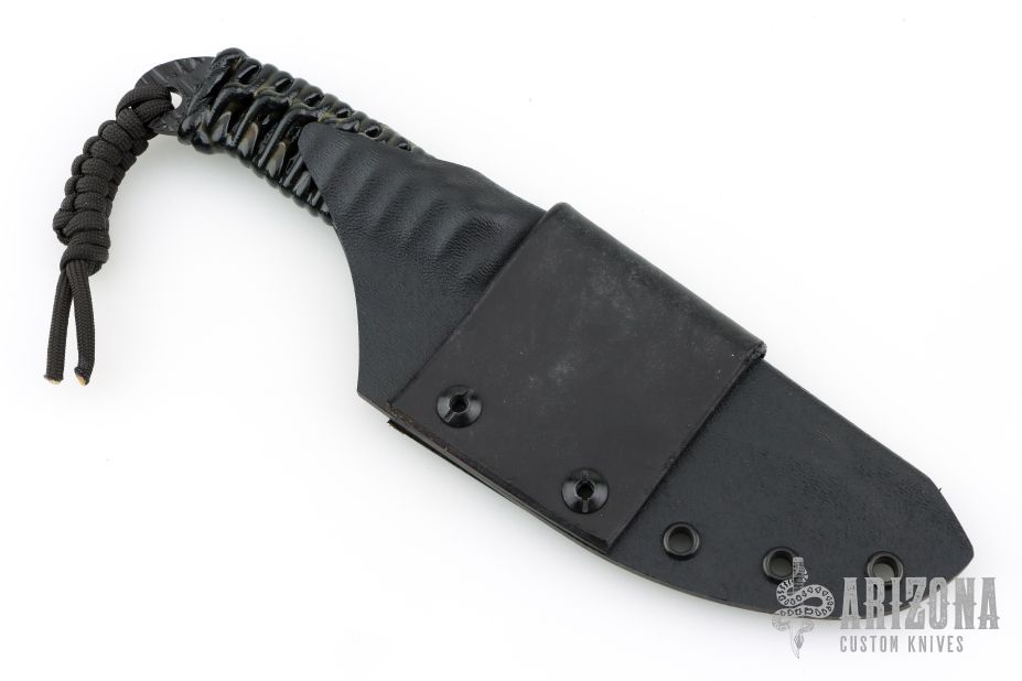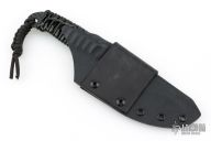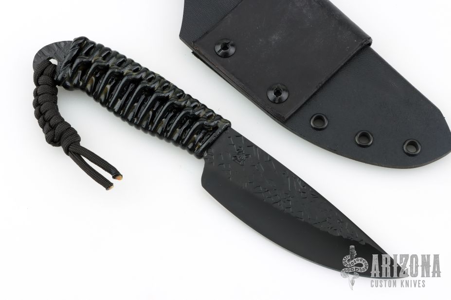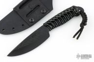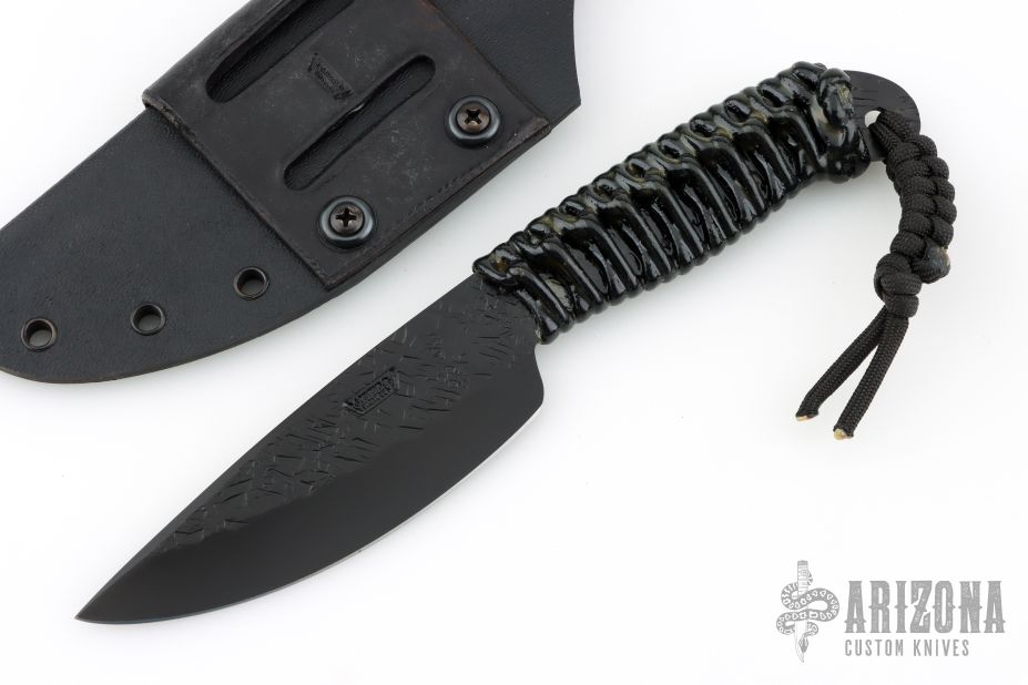 This Pro Series LT Drop Point by James Behring features a black hammer marked 01 tool steel blade with .124" blade stock and 1.424" blade depth, full tang construction with black epoxied cord wrap. Hammermark finish flats and tang. Includes a kydex sheath with leather belt loop. Excellent condition.