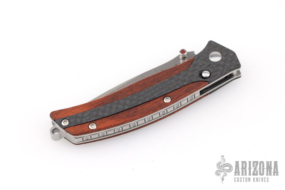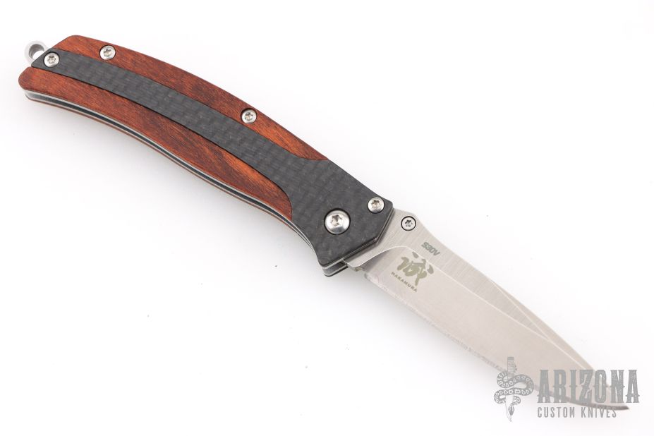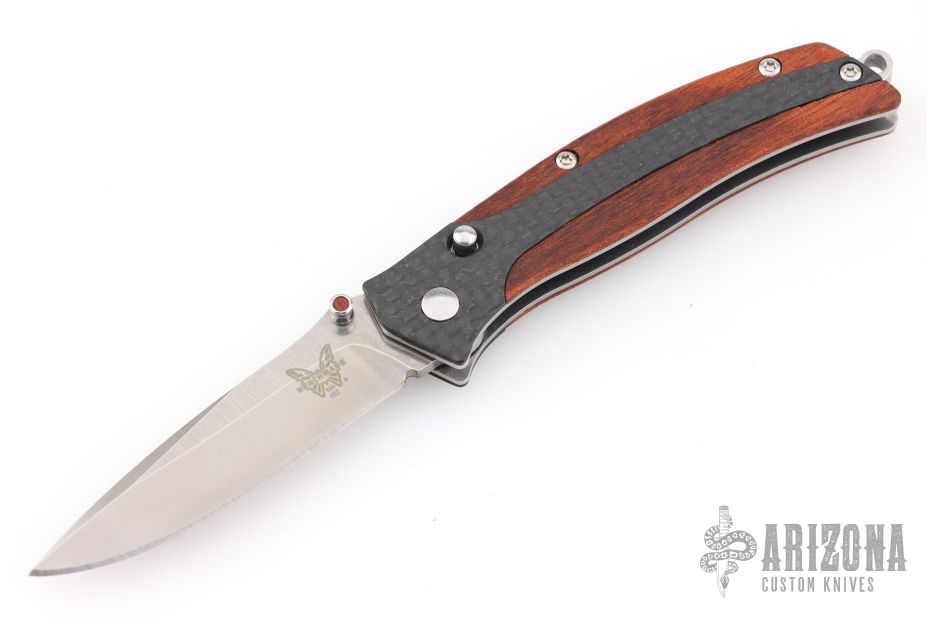 The Megumi by Benchmade is a gentleman's knife with a stonewashed assisted opening blade and Benchmade's Nak-Lock and Cocobolo inlaid thumb stud. The handle is outfitted with Cocobolo wood, carbon fiber scales and finished with a stainless steel backspacer with lanyard hole. Comes with original box, pouch, and papers. Excellent Condition.