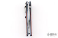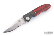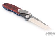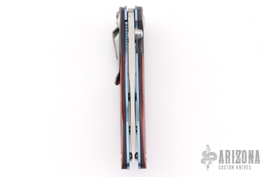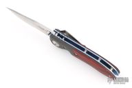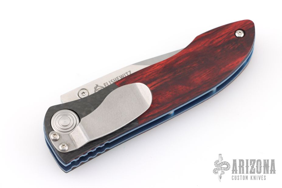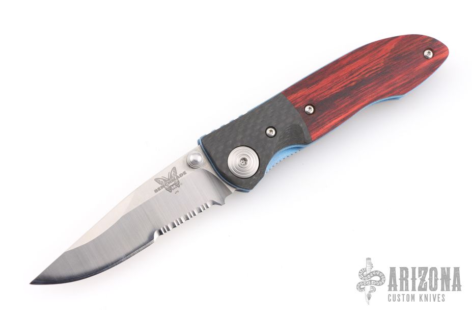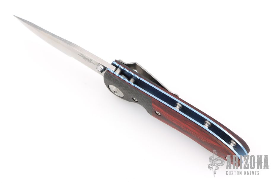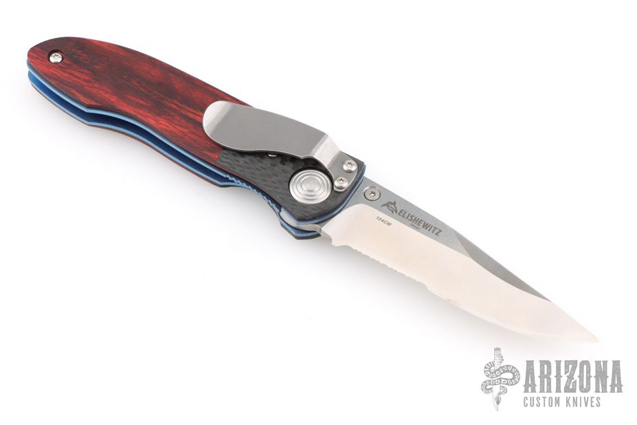The 690 Elishewitz is a discontinued linerlock folder by Benchmade. It features a clip point satin finished partially serrated blade with carbon fiber dovetailed bolsters, rosewood scales, and anodized titanium liners, tip down stainless steel clip. Comes with unlabeled blue BM box. Has a couple light scuffs, excellent condition.