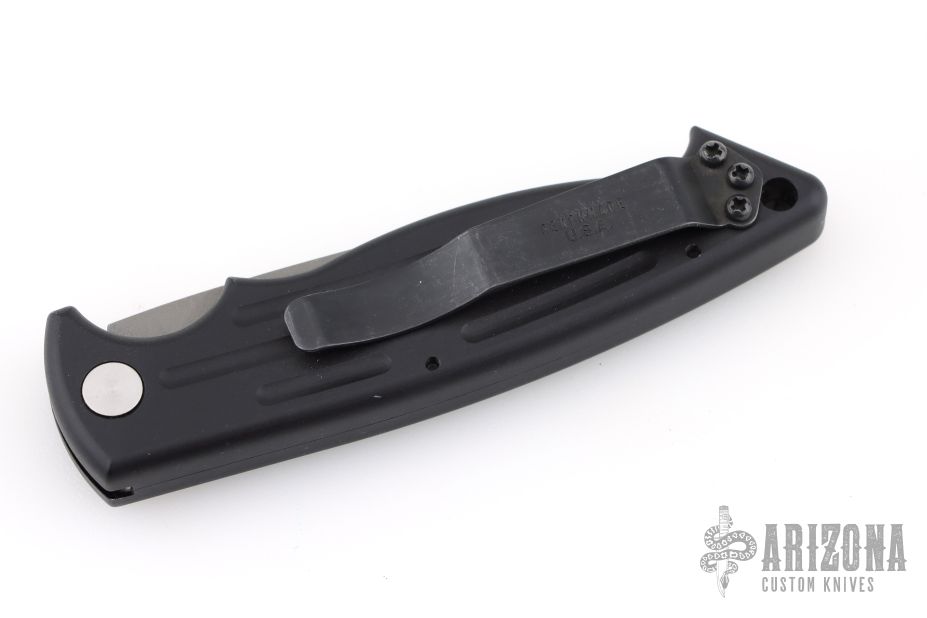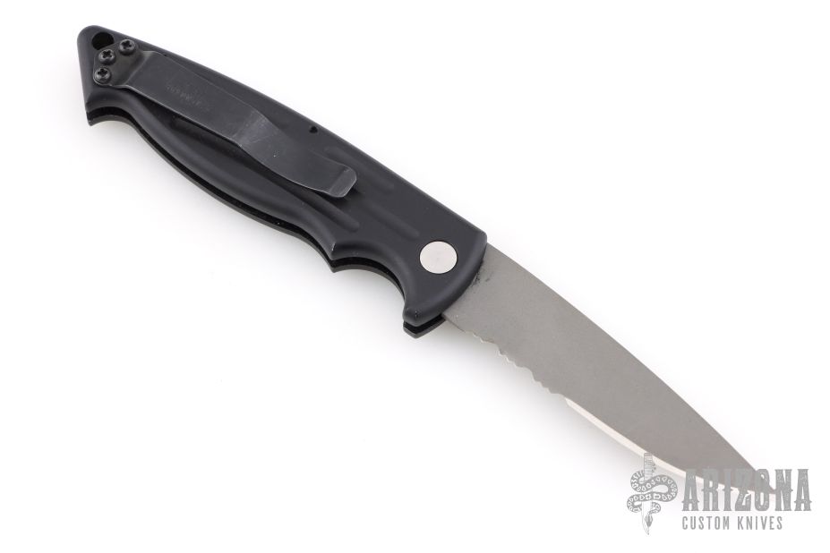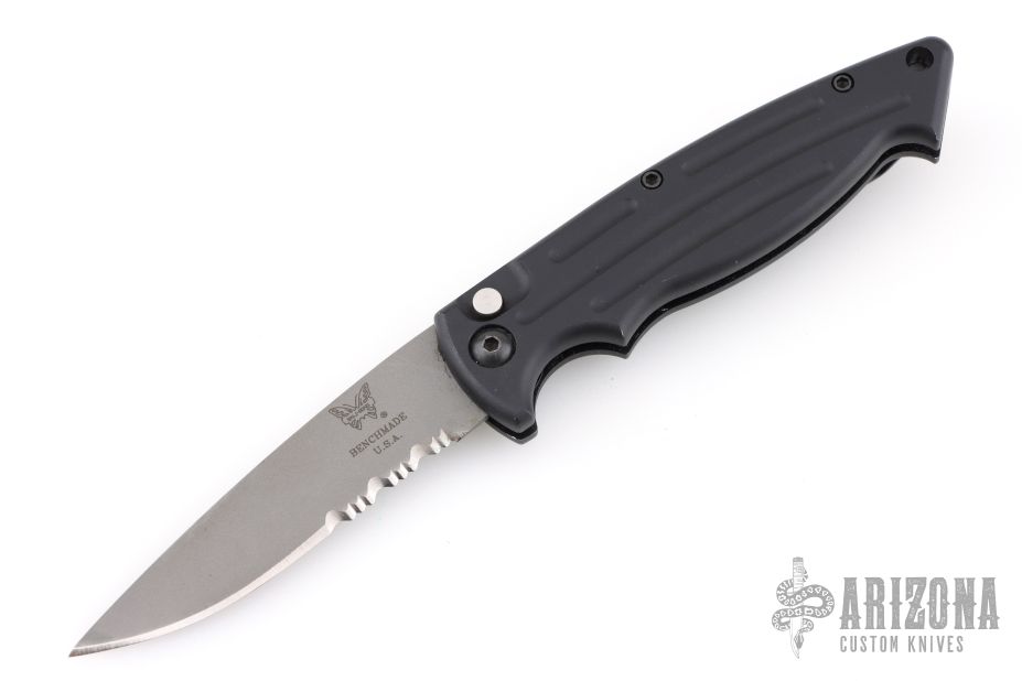 This Mini Reflex by Benchmade features a partially serrated blade and a black aluminum handle with black stainless steel tip up clip, lanyard hole at the butt and safety on the spine. Comes with original box and papers. Has some scuffs and scratches, great overall condition.