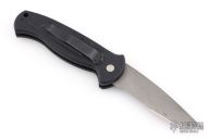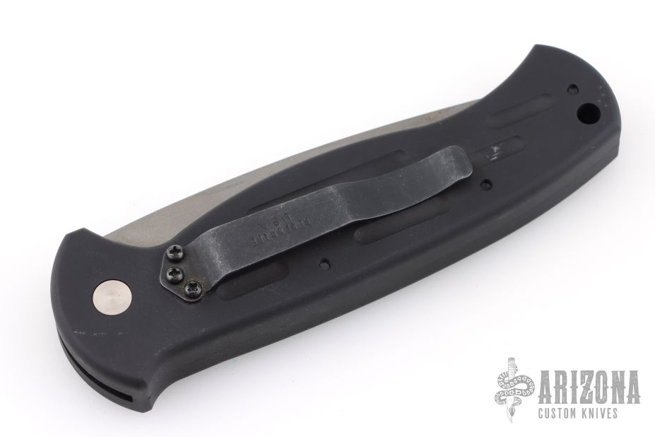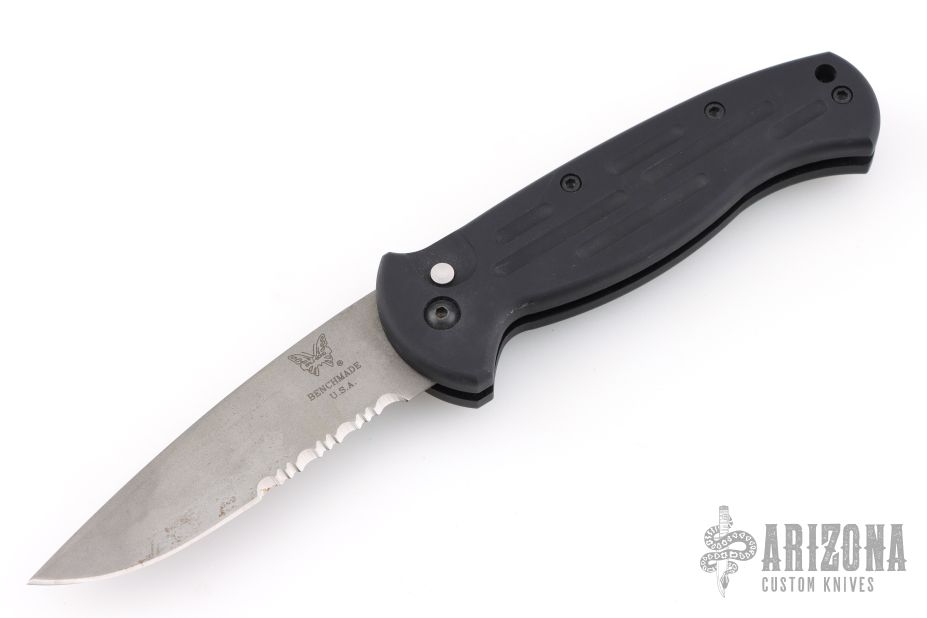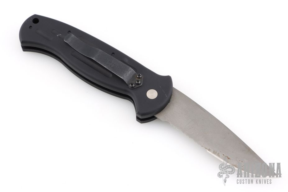 This Early AFO Automatic from Benchmade features a bead blasted drop point blade with swedge and partial serrations. The handle is comprised of black aluminum with a lanyard hole in pommel. Comes with original box and papers. Has a few light scuffs, otherwise great condition.