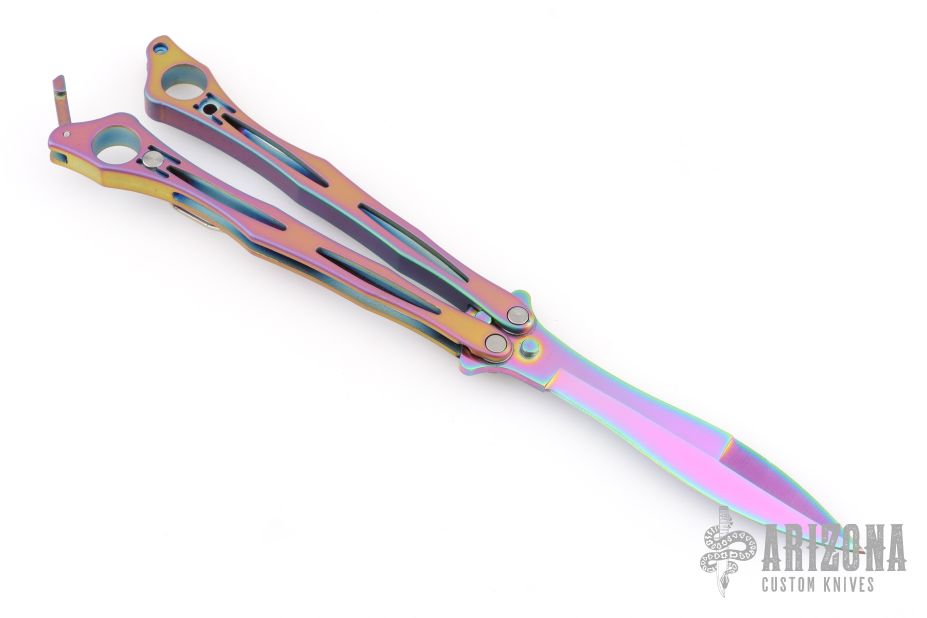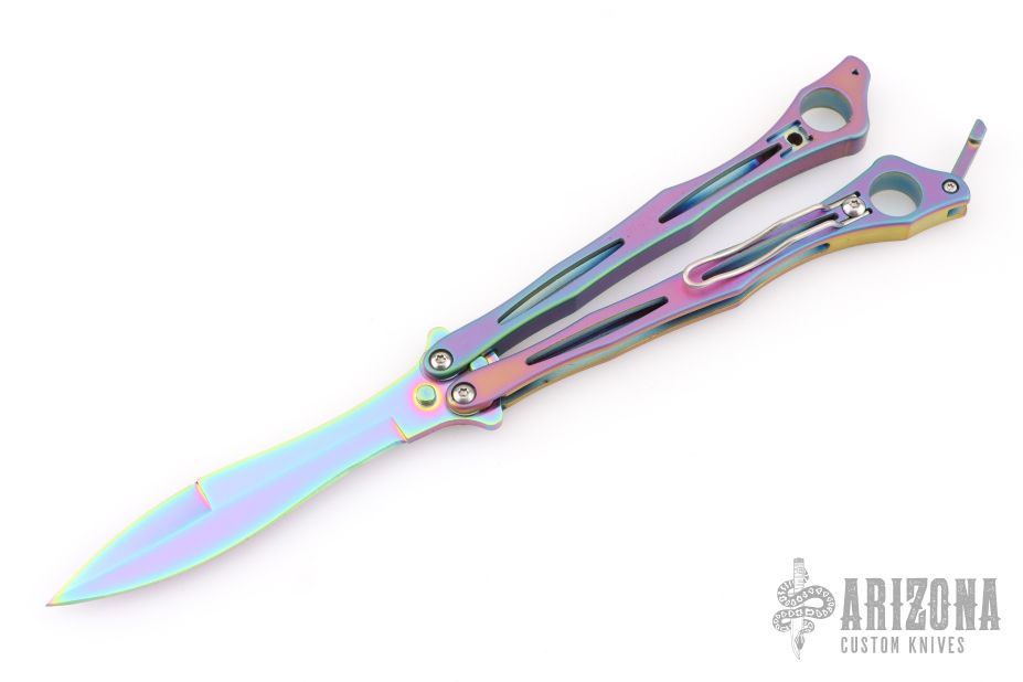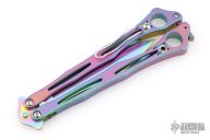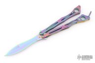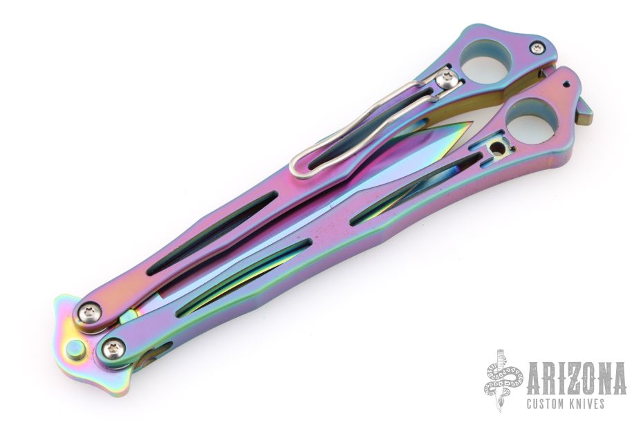 This Spyderfly from Spyderco features a rainbow finished spear point blade with a false top edge. The handles are rainbow finished stainless steel with a tip up clip (4-way reversible). Comes with original box and papers. Has some light scuffs, excellent condition otherwise.