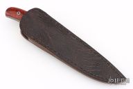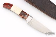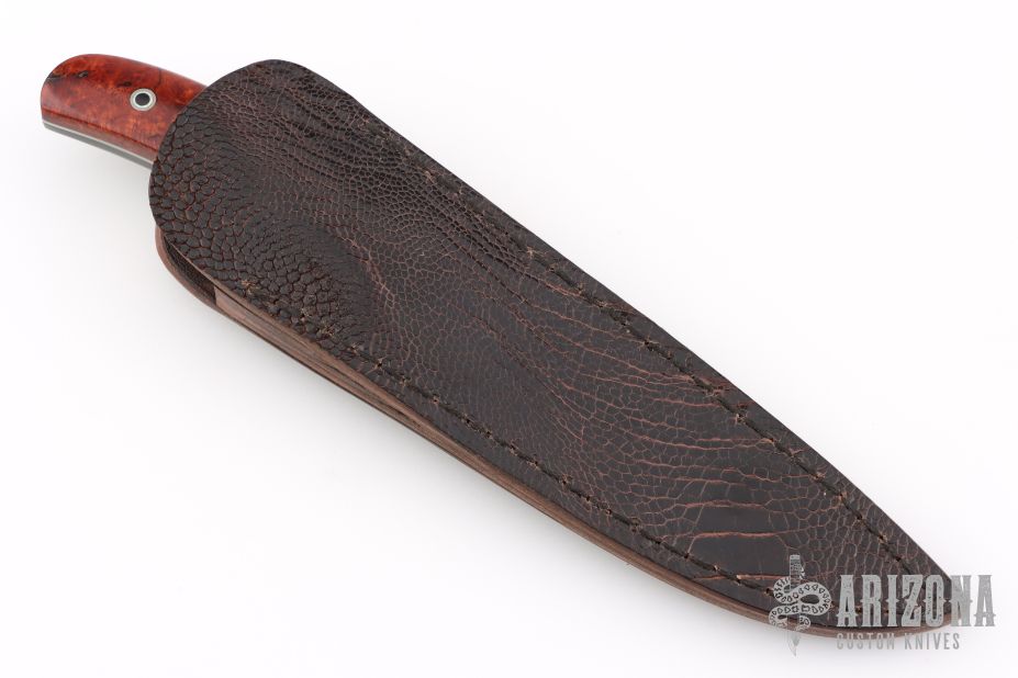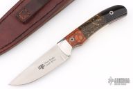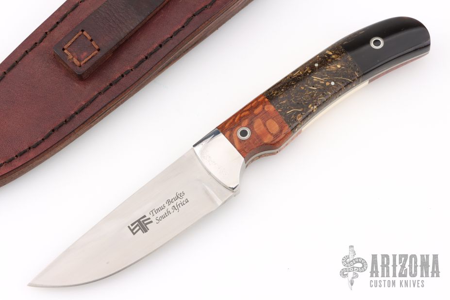 This knife by Tinus Beukes features a hand rub satin finished drop point blade with .123" blade stock and 1.192" blade depth, full tapered tang construction. The handle has mirror polished stainless steel bolsters, multi-piece scales consisting of lacewood/stabilized grass/buffalo horn/stabilized corn cob/warthog tusk/burl wood. Comes with a brown leather sheath with ostrich leg skin overlay. Has a couple light scratches, otherwise excellent condition.