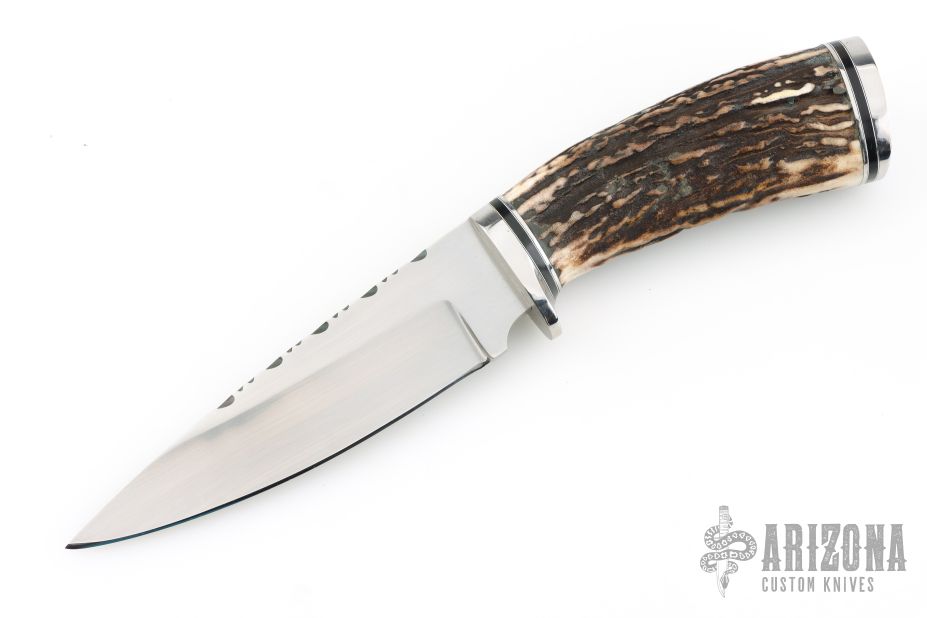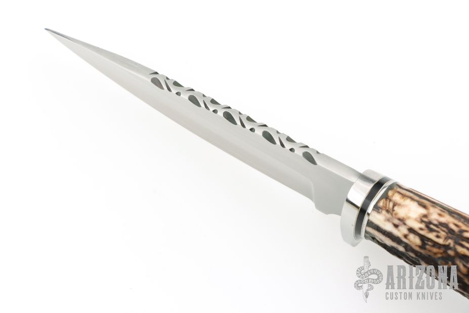 This Knife by Chuck Anderson features a hand rub satin finished blade with fileworked spine, .194" blade stock and 1.482" blade depth, hidden tang construction. The handle has a stainless steel guard and butt, stag grip and white/black/stainless steel spacers. Excellent condition.