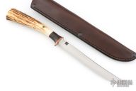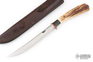 This Fillet Knife by James Behring features a satin finished upswept blade, .081" blade stock and .699" blade depth, hidden tang construction. The handle has a copper guard, stag grip with single copper pin, and black/copper/black linen micarta spacer pattern. Comes with a brown leather sheath made by Warlander Leather. Excellent condition.