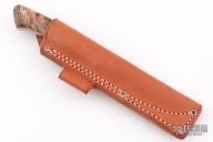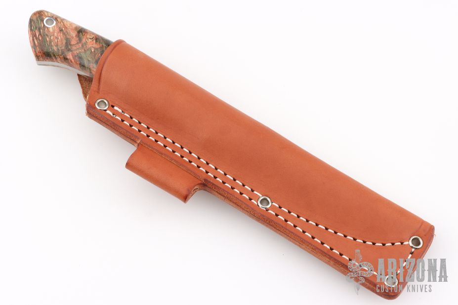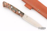 This Aurora by Bark River Knives features a satin finished blade with .157" blade stock and 1.002" blade depth, full tang construction. The handle has Salmon/Green/Gold Box Elder Burl scales. Comes with a brown leather sheath and original box. Excellent condition.