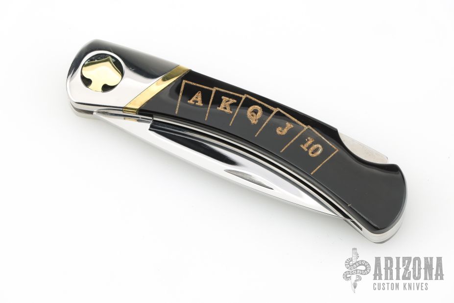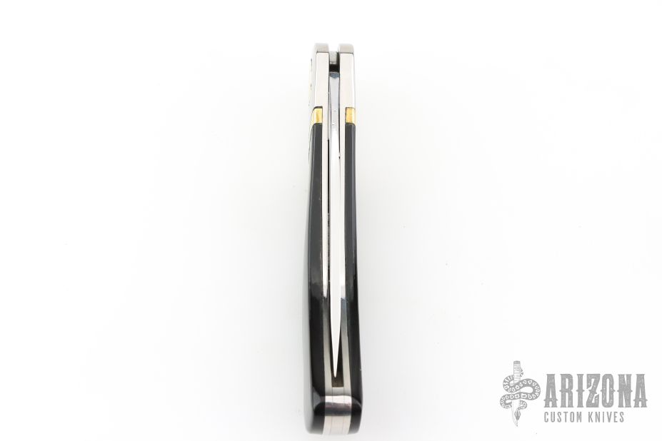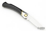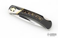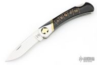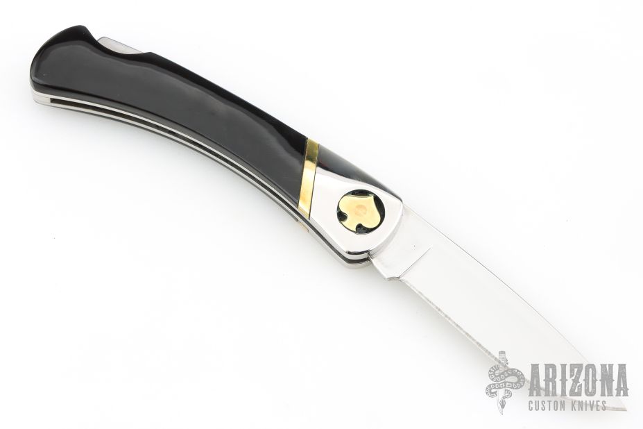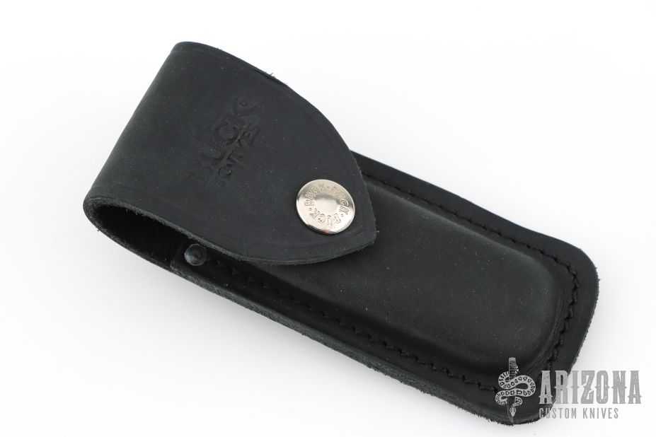 This lock back folder by Buck features a satin finished clip point blade with nail nick. The handle has brushed stainless steel bolsters with integral liners, carved bone inlays, and stainless rockerbar. Comes with original box, papers and black leather sheath. Has some light scratches, otherwise Excellent condition.