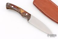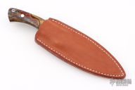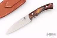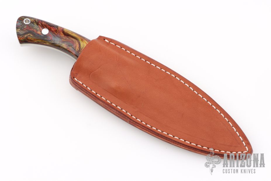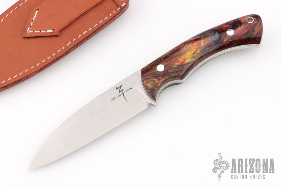 The Goshawk by Zoe Crist Knives has a satin finish blade, .175" black stock and 1.270" blade depth, full tang construction. The handle has amber resin scales with white liners, and lanyard hole in pommel. Comes with original box, COA, and leather sheath. Excellent condition.