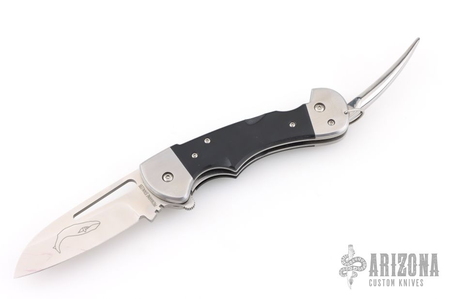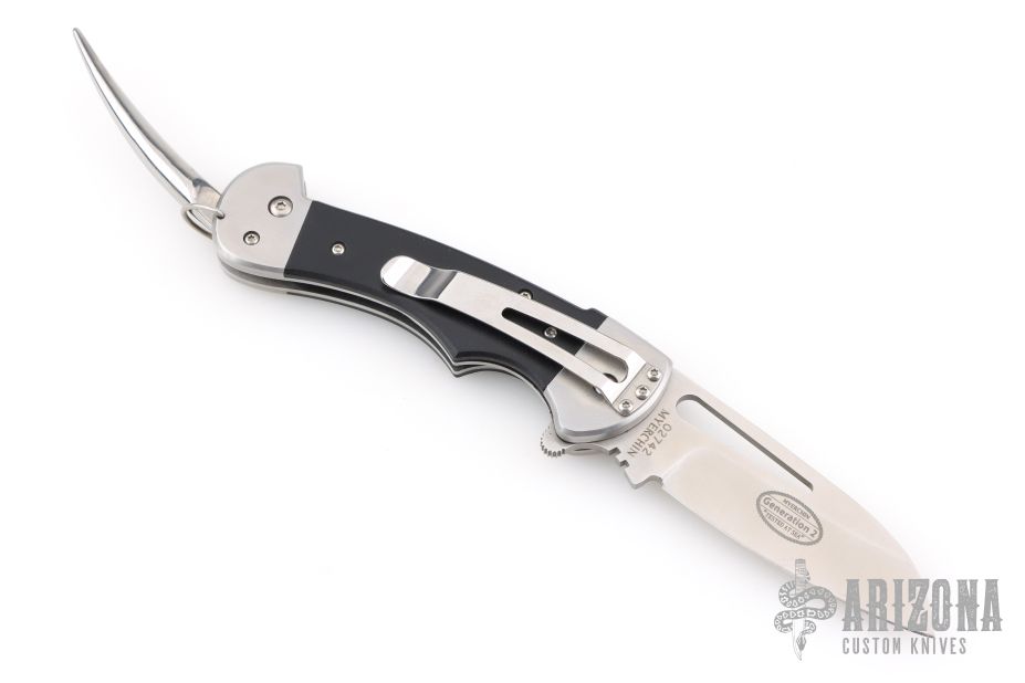 Our newest design for the seaman who wants the most durable rigging knife available. Crafted from Stainless, high tec composite G10 handle material and German Marine Stainless Steel. G10 is a man made material that is impervious to the elements and it is the strongest handle for a knife intended for use at sea. The black G10 is an excellent base for the sailor’s own scrimshaw using white India ink. This knife thoughtfully links heritage with the most modern components. The Pro-grade German Marine stainless that we use is comparable to 440C for hardness and edge-holding properties with additional anti-oxidation elements added for the final crafting of our knives. The G10 handles are crafted from some of the most sought after materials for lasting beauty and rugged use. We complete our G10 handles with a non polished, easily gripped finish. Extreme strength and light weight. The Generation 2 Series features our advanced, springless locking mechanism (securely locks blade, spike, or both) / Includes Cordura nylon sheath / belt (or pocket) clip / Serial Number / One hand open that allows the user to easily and safely open the blade under difficult conditions. Standard Blade. Built on our new heavy duty BF300 Frame, this is a knife that will easily last a lifetime… or two. Gift Box included.