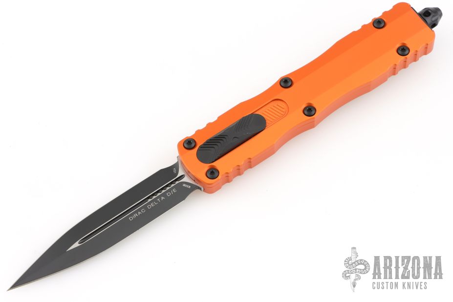 This Dirac Delta OTF automatic by Microtech features a D/E black blade with a standard edges. The handle is orange aluminum with stainless steel tip down clip and black hardware. Serial number 17270 and dated 10/2025. Comes with original box and papers. Excellent Condition.