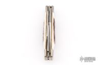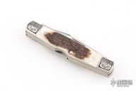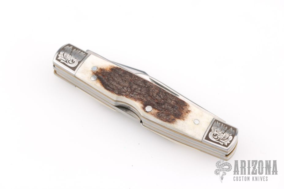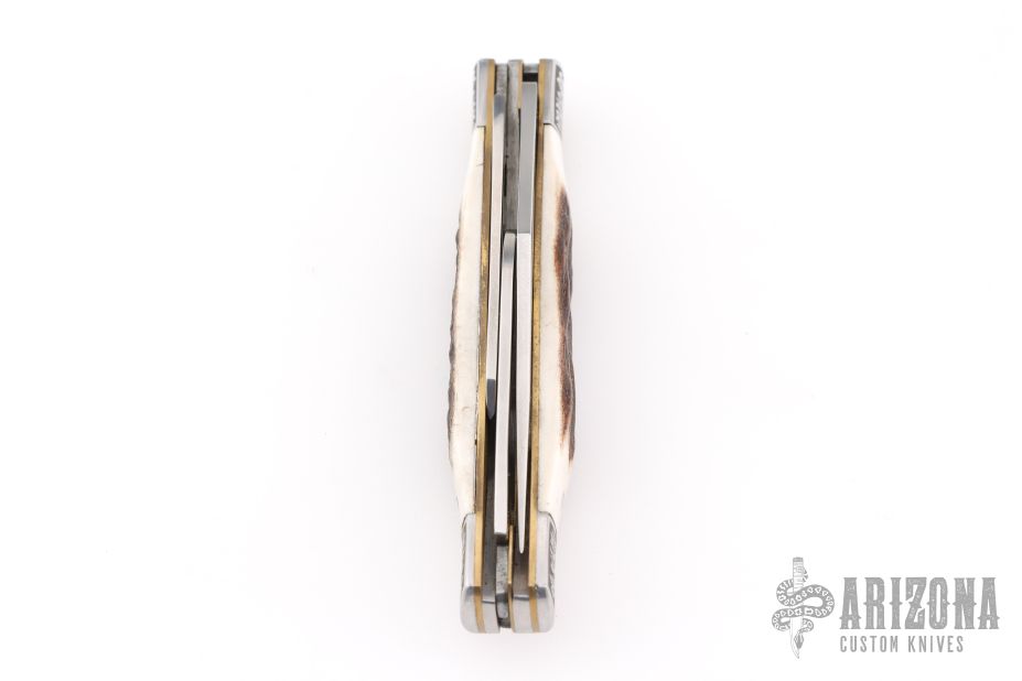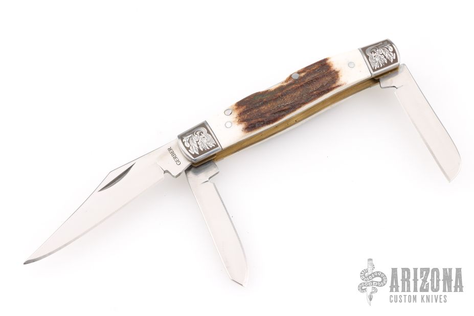 This knife by Gerber features a mirror polished blades with nail nicks. The handle has (either etched or laser engraved) stainless steel bolsters, stag scales, brass liners, steel springs. Comes in a Gerber metal tin/box. Excellent condition.