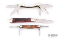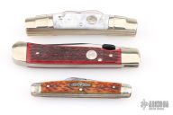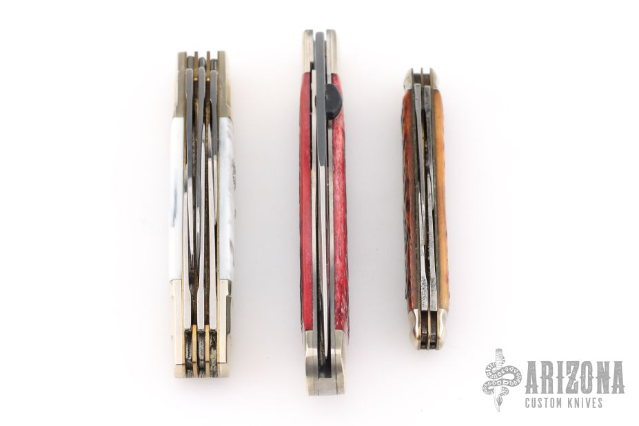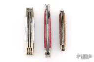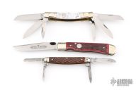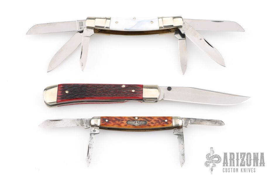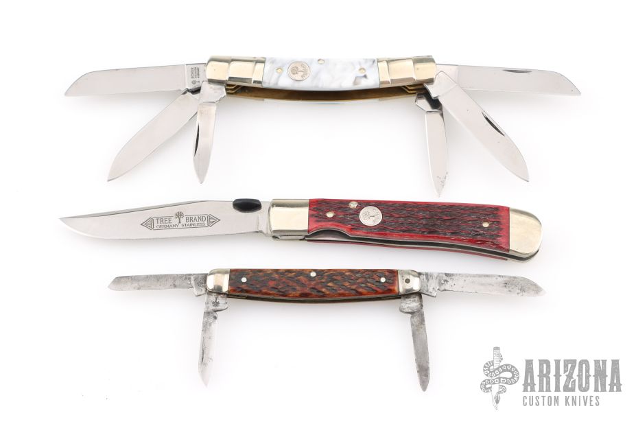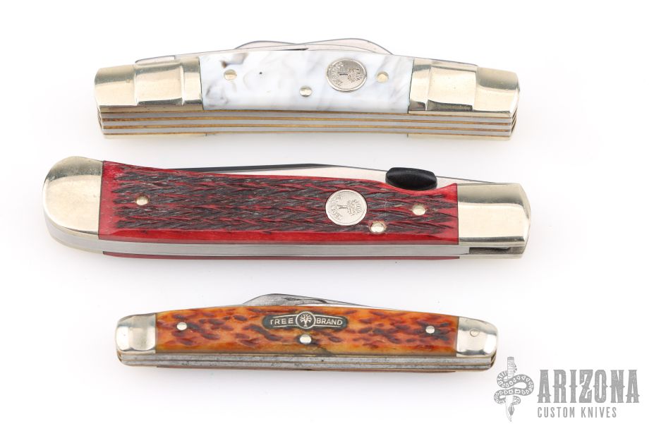 This lot of Tree Brand Folders by Boker features nickel silver bolsters, bone scales, brass liners and stainless steel springs. Stainless steel blades with nail nicks. Two are slipjoints and one is a linerlock. Comes with two box and papers. The knives are in excellent condition with just a few light scratches. The vintage one has some patina, and scratches, great overall condition otherwise.