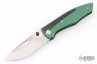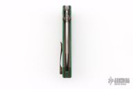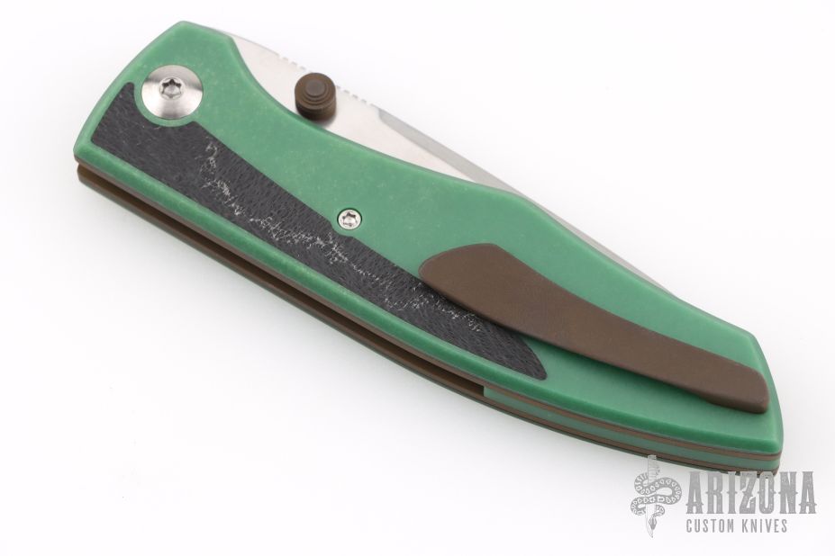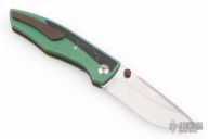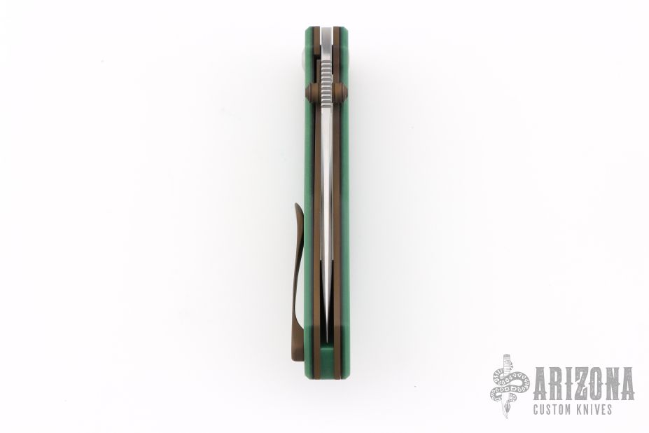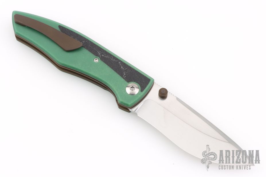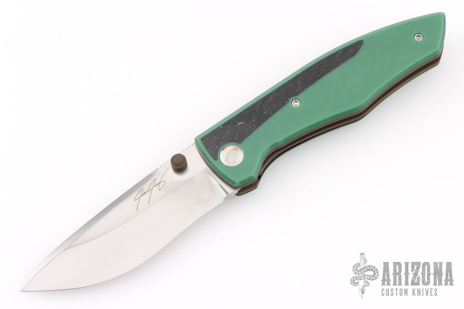 This Archon liner lock by Jesse Jarosz features a hand rub satin finished SK2 steel blade with dual thumb studs and notched thumbrest. The handle has Emerald green paper micarta scales with F-16 CMC inlays and black liners, black lip pearl inlaid titanium pivot, blasted and anodized titanium liners, Emerald green paper micarta backspacer, anodized titanium tip up clip with hidden screws. Nice lock up, detent and blade seating. Comes with zippered case and COA dated 1-26. New from maker!