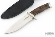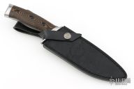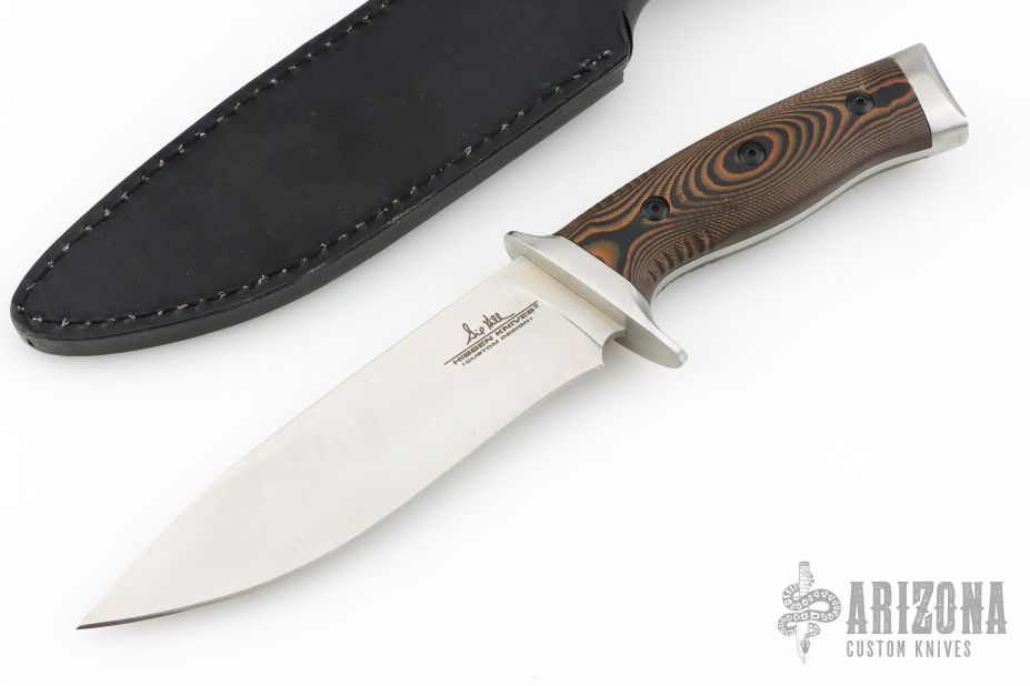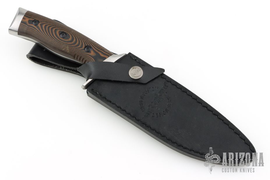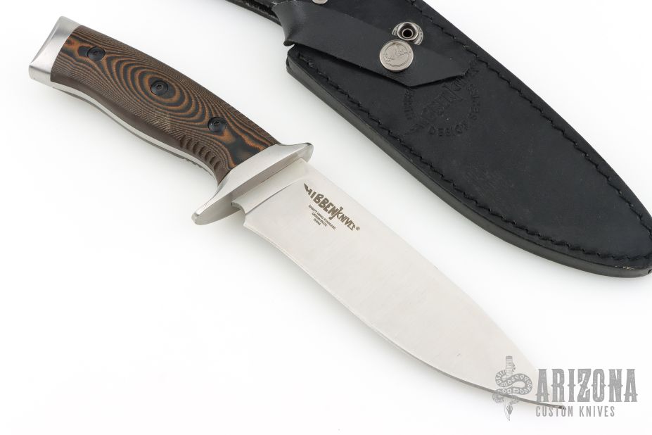 This knife was designed by master knife maker Gil Hibben, an avid hunter and fisherman. His firsthand experience as an Alaskan hunting guide contributed to the design of this custom knife. It has a full-tang, 6 1/2” razor-sharp 420HC stainless steel blade, complemented by a stainless steel guard and pommel. The handsome CNC machined, layered Micarta handle scales have a knothole pattern and are secured to the tang by heavy-duty screws. The handle features ridges just below the handguard to improve control when using the knife. The 11” overall length, fixed blade knife slides securely into a premium black leather belt sheath with a snap closure. When it comes to knives, Gil Hibben always knows exactly what you need!