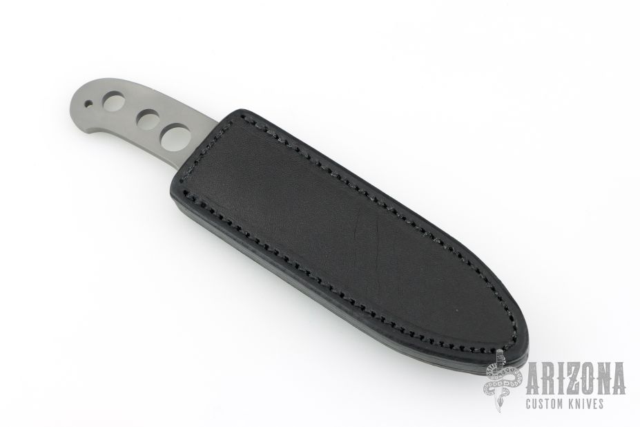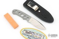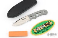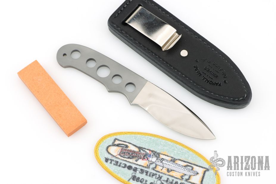 The Triathlete is a non-catalog knife by Randall Made Knives. It has a satin finished blade with notched thumbrest, .171" blade stock and 1.044" blade depth, integral construction. Notched thumbrest. Bead blast handle. Comes with black leather sheath with belt clip. Comes with stone and original paper wrapping. Excellent condition.