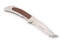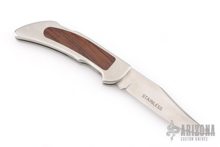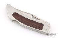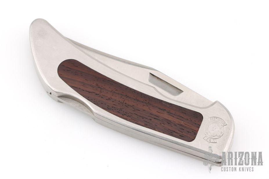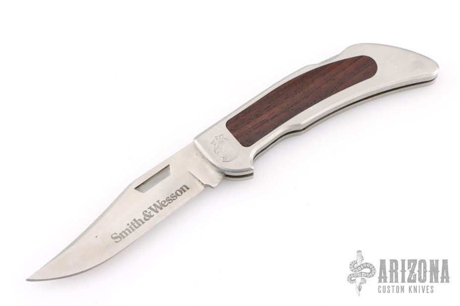 This vintage lockback folder by Smith and Wesson features satin finished blade with nail nick. The handle has a stainless steel frame with wood inlays. Has some light scuffs and scratches, great overall condition.