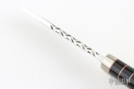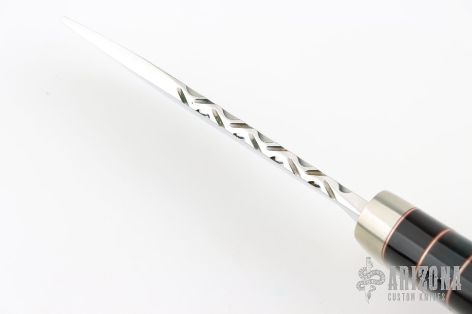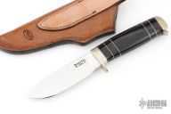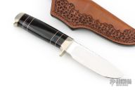This knife by Randy Lee features a mirror polished blade with fileworked spine, .180" blade stock and 1.193" blade depth, hidden tang construction. The handle has a nickel silver guard and butt, buffalo horn grip, and a spacer pattern consisting of red/nickel silver/buffalo horn/acrylic. Comes with a hand tooled brown leather sheath. Has a couple light scratches, otherwise excellent condition. Comes with a zippered case and COA.