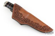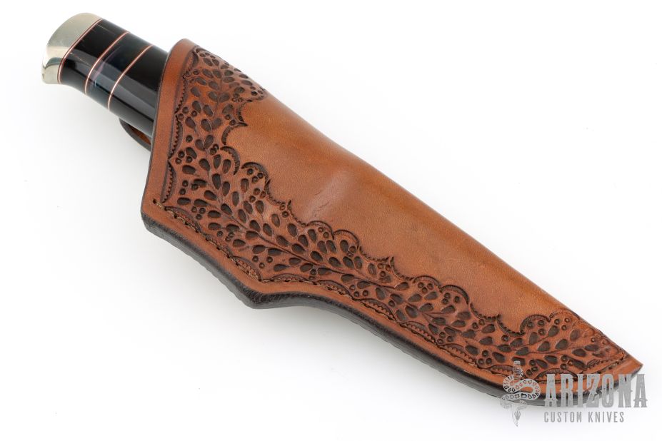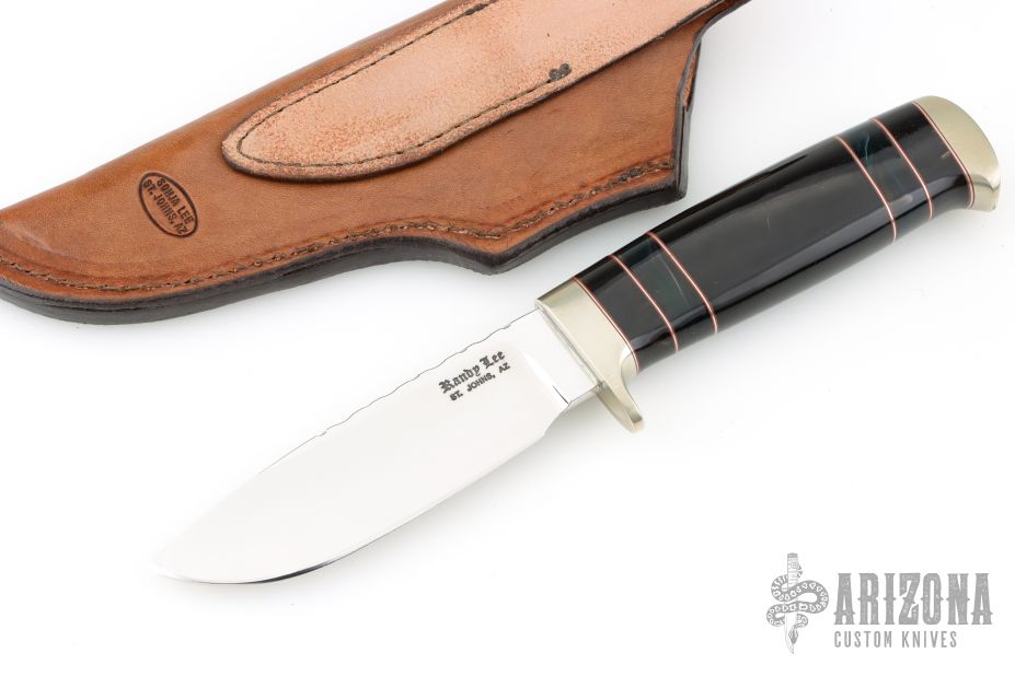 Randy’s fascination with knives began as a young man when he made his first knife in a high school “metals” class. He collected them for years and eventually began making his own to get a better edge-holding skinner for hunting. Randy read books and visited local makers to learn the craft. In 1979, he decided to invest in shop equipment so that he could properly master his knife making skills. In a few years, he was making and selling knives to local hunters, while continually developing his style and craftsmanship. He attended his first knife show in 1986 and has been participating in about six shows each year since then. As an avid hunter, Randy knows how a good hunting knife should perform. He loves to “field-test” his designs and feels that a quality knife should not only look great, but perform well as a tool. He offers a wide variety of knife styles; from utility hunters and fighters to collector pieces such as daggers and bowies. Although the actual work of grinding and buffing knives is very tedious, he always finds it rewarding to see the final finished product. Randy particularly enjoys meeting people who find knives as interesting and exciting as he does. Randy’s wife, Sonja Lee, is one of the premier sheath makers in the business. Using exotic hides, or leather and various forms of tooling, she has mastered the craft of sheath making. Sonja creates the custom sheaths which are provided for each of Randy Lee’s knives and she is now making custom sheaths for many other knife makers and collectors.