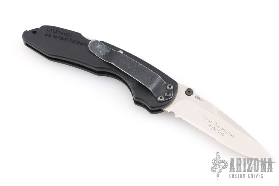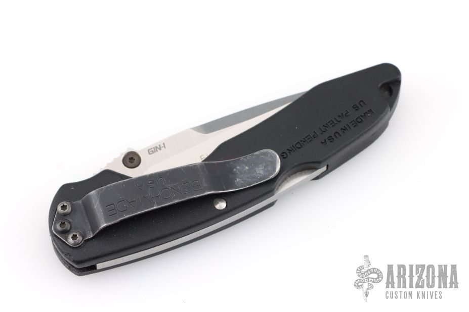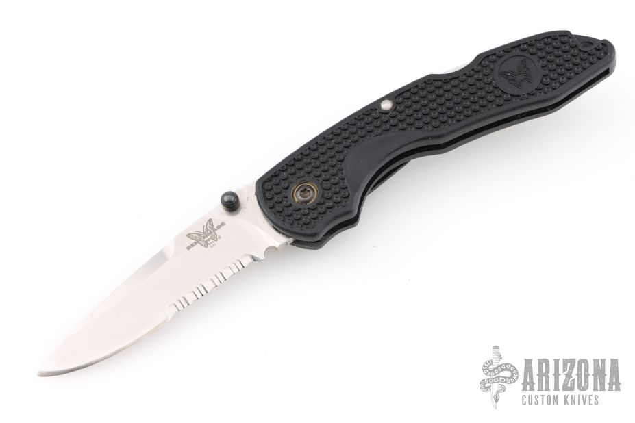 This Benchmade 821S features a stonewash finished partially serrated drop point blade with single thumbstud and notched thumb ramp. The handle has textured FRN covers with steel spring. Comes in the wrong BM box and papers. Has some scuffs and scratches, great condition otherwise.