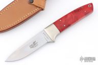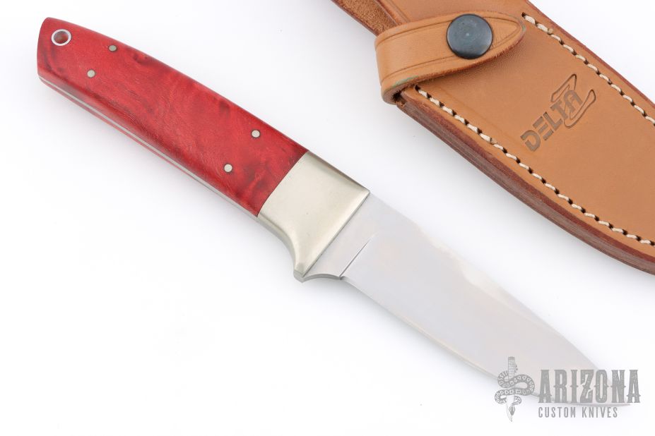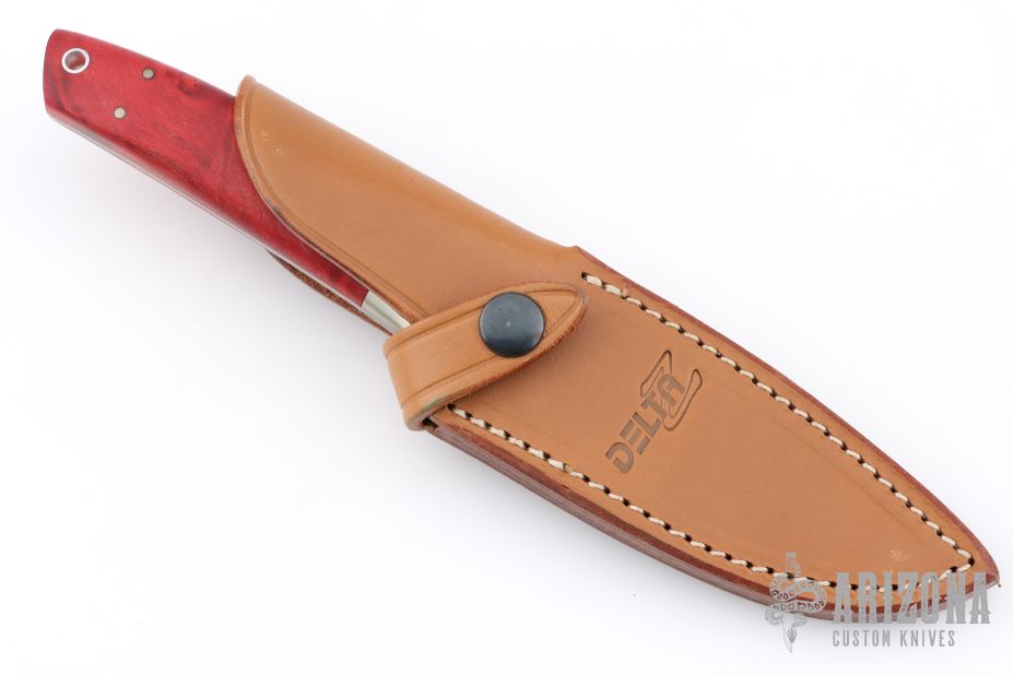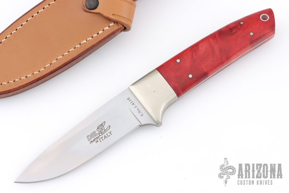 This fixed blade by Delta Z has nickel silver bolster and dyed and stabilized burl wood scales. Full tapered tang construction with lanyard tube and nickel silver pins. It has a satin finished blade, .149" blade stock 1.069" blade depth. Comes with a brown leather sheath. Excellent condition. Has 1.4116 Steel blade