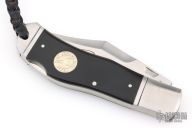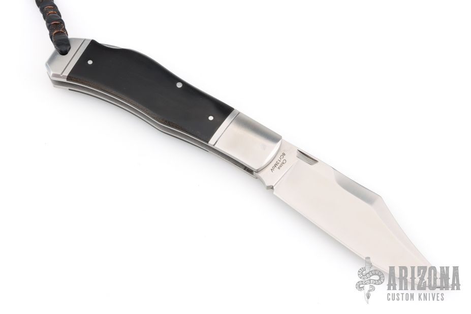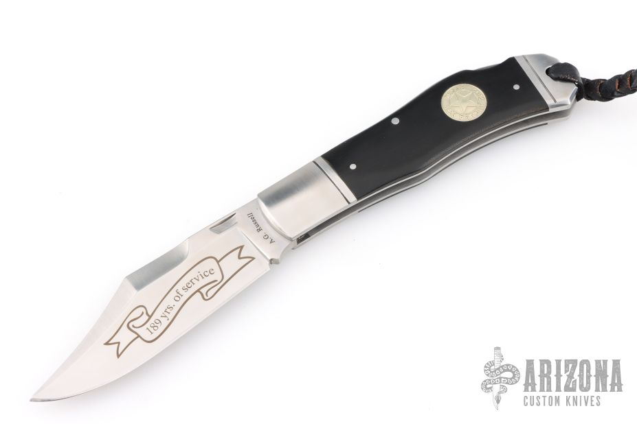 This Texas Rangers 191 Year Commemorative by AG Russell features a satin finished blade with nail nick. The handle has stainless bolsters, G10 covers with a nickel silver escutcheon, stainless liners and spring. Dated 2012. Comes with original box. Has a couple light scuffs, excellent condition.
