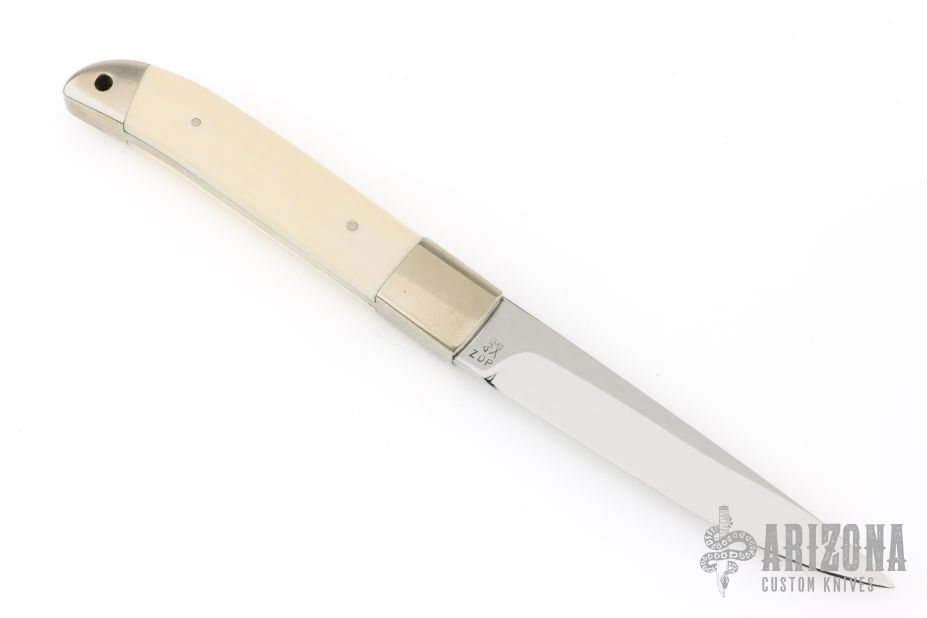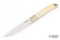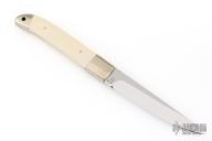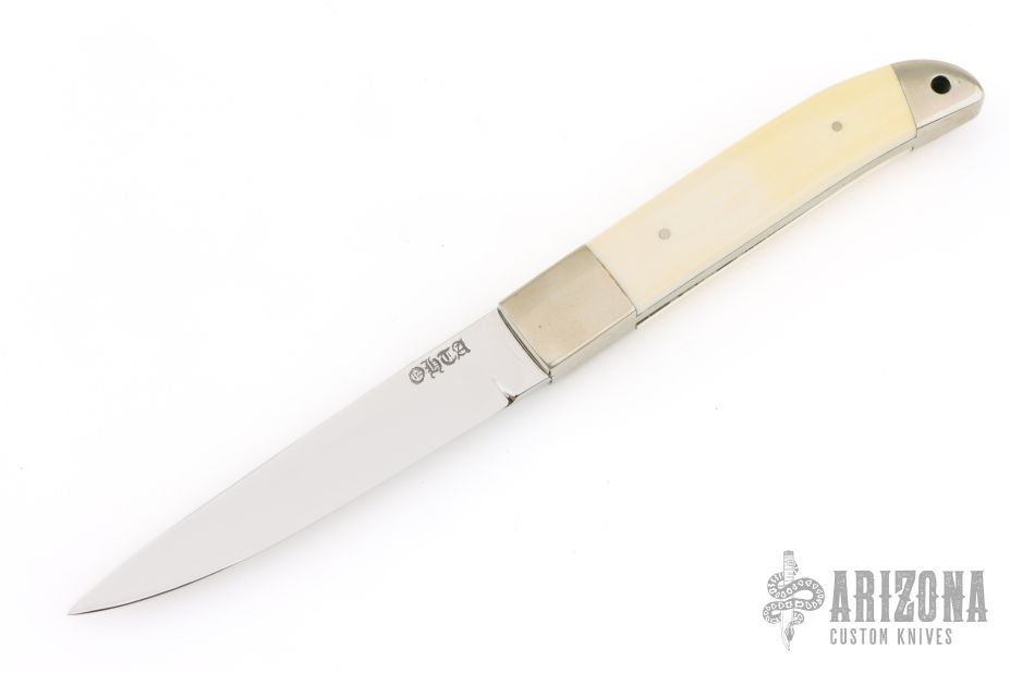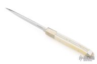 This Kwaiken by Nobutaka Ohta features a mirror finished blade with .125" blade stock and .722" blade depth, hidden/frame tang construction. The handle has nickel silver bolsters, mammoth ivory scales with nickel silver pins, nickel silver rear bolsters with lanyard hole, nickel silver frame with mammoth ivory inlays on the spine. Excellent condition.