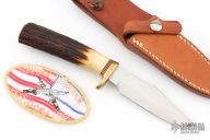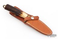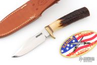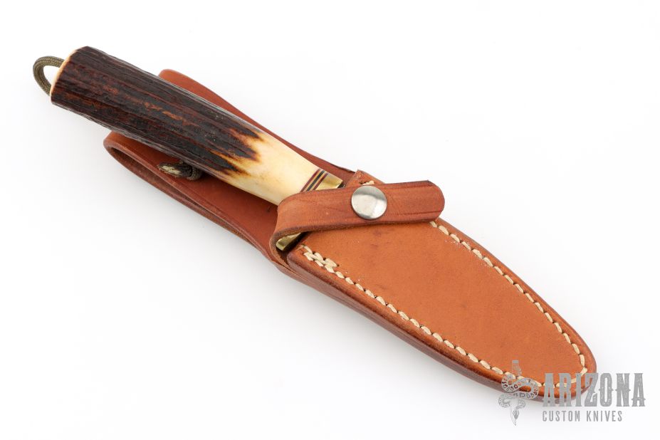 This Model 8-4 by Randall Made Knives features a satin finished blade with sharpened top edge, .152" blade thickness, 1.062" blade depth, hidden tang construction. Especially suitable for small fish and feathered game. Brass guard and stag grip with red/white/blue spacers. Comes with a brown leather sheath. Has a light scratches, otherwise good condition. Comes with a Randall Made Knives Patch.